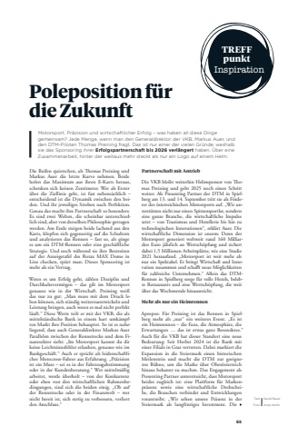 65Motorsport, Pr%u00e4zision und wirtschaftlicher Erfolg %u2013 was haben all diese Dinge gemeinsam? Jede Menge, wenn man den Generaldirektor der VKB, Markus Auer, und den DTM-Piloten Thomas Preining fragt. Das ist nur einer der vielen Gr%u00fcnde, weshalb sie das Sponsoring ihrer Erfolgspartnerschaft bis 2026 verl%u00e4ngert haben. %u00dcber eine Zusammenarbeit, hinter der weitaus mehr steckt als nur ein Logo auf einem Helm.Poleposition f%u00fcr die ZukunftDie Reifen quietschen, als Thomas Preining und Markus Auer die letzte Kurve nehmen. Beide holen das Maximum aus ihren E-Karts heraus, schenken sich keinen Zentimeter. Wer als Erster %u00fcber die Ziellinie geht, ist fast nebens%u00e4chlich %u2013 entscheidend ist die Dynamik zwischen den beiden. Und ihr jeweiliges Streben nach Perfektion. Genau das macht ihre Partnerschaft so besonders: Es sind zwei Welten, die scheinbar unterschiedlich sind, aber von derselben Philosophie getragen werden. Am Ende steigen beide lachend aus den Karts, klopfen sich gegenseitig auf die Schultern und analysieren das Rennen %u2013 fast so, als ginge es um ein DTM-Rennen oder eine gesch%u00e4ftliche Strategie. Und noch w%u00e4hrend sie ihre Bestzeiten auf der Anzeigetafel des Rotax MAX Dome in Linz checken, sp%u00fcrt man: Dieses Sponsoring ist mehr als ein Vertrag.Wenn es um Erfolg geht, z%u00e4hlen Disziplin und Durchhalteverm%u00f6gen %u2013 das gilt im Motorsport genauso wie in der Wirtschaft. Preining wei%u00df das nur zu gut: %u201eMan muss mit dem Druck leben k%u00f6nnen, sich st%u00e4ndig weiterzuentwickeln und Leistung bringen, auch wenn es mal nicht perfekt l%u00e4uft.%u201c Diese Werte teilt er mit der VKB, die als mittelst%u00e4ndische Bank in einem hart umk%u00e4mpften Markt ihre Position behauptet. So ist es naheliegend, dass auch Generaldirektor Markus Auer Parallelen zwischen der Rennstrecke und dem Finanzsektor sieht: %u201eIm Motorsport kannst du dir keine Leichtsinnsfehler erlauben, genauso wie im Bankgesch%u00e4ft.%u201c Auch er spricht als leidenschaftlicher Motocross-Fahrer aus Erfahrung. %u201ePr%u00e4zision ist ein Muss %u2013 sei es in der Fahrzeugabstimmung oder in der Kundenberatung.%u201c Wer mittelm%u00e4%u00dfig arbeitet, werde %u00fcberholt %u2013 von der Konkurrenz oder eben von den wirtschaftlichen Rahmenbedingungen, sind sich die beiden einig. %u201eOb auf der Rennstrecke oder in der Finanzwelt %u2013 wer nicht bereit ist, sich stetig zu verbessern, verliert den Anschluss.%u201cPartnerschaft mit AntriebDie VKB bleibt weiterhin Helmsponsor von Thomas Preining und geht 2025 noch einen Schritt weiter: Als Presenting Partner der DTM in Spielberg am 13. und 14. September tritt sie als F%u00f6rderer des %u00f6sterreichischen Motorsports auf. %u201eWir unterst%u00fctzen nicht nur einen Spitzensportler, sondern eine ganze Branche, die wirtschaftliche Impulse setzt %u2013 von Tourismus und Hotellerie bis hin zu technologischen Innovationen%u201c, erkl%u00e4rt Auer. Die wirtschaftliche Dimension ist enorm: Denn der Motorsport generiert weltweit rund 160 Milliarden Euro j%u00e4hrlich an Wertsch%u00f6pfung und sichert dabei 1,5 Millionen Arbeitspl%u00e4tze, wie eine Studie 2021 herausfand. %u201eMotorsport ist weit mehr als nur ein Spektakel. Er bringt Wirtschaft und Innovation zusammen und schafft neue M%u00f6glichkeiten f%u00fcr zahlreiche Unternehmen.%u201c Allein das DTMRennen in Spielberg sorge f%u00fcr volle Hotels, belebte Restaurants und eine Wertsch%u00f6pfung, die weit %u00fcber das Wochenende hinausreicht.Mehr als nur ein HeimrennenApropos: F%u00fcr Preining ist das Rennen in Spielberg mehr als %u201enur%u201c ein weiteres Event. %u201eEs ist ein Heimrennen %u2013 die Fans, die Atmosph%u00e4re, die Erwartungen %u2026 das ist etwas ganz Besonderes.%u201c Auch f%u00fcr die VKB hat dieser Standort eine neue Bedeutung: Seit Herbst 2024 ist die Bank mit einer Filiale in Graz vertreten. Dabei markiert die Expansion in die Steiermark einen historischen Meilenstein und macht die DTM zur geeigneten B%u00fchne, um die Marke %u00fcber Ober%u00f6sterreich hinaus bekannt zu machen. Das Engagement als Presenting Partner unterstreicht, dass Motorsport beides zugleich ist: eine Plattform f%u00fcr Markenpr%u00e4senz sowie eine wirtschaftliche Drehscheibe, die Branchen verbindet und Entwicklungen vorantreibt. %u201eWir sehen unsere Pr%u00e4senz in der Steiermark als langfristiges Investment. Die Text David BauerFoto Antje WolmTREFFpunktInspiration