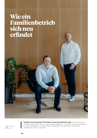 100Wie ein Familienbetrieb sich neu erfindetTradition oder Innovation? F%u00fcr Holter ist das kein Entweder-oder. Das 150 Jahre alte Familienunternehmen zeigt, wie man beides verbindet %u2013 und damit sogar die Generation Z f%u00fcr eine vermeintlich %u201eunsexy%u201c Branche begeistert. Michael Holter und Markus Steinbrecher wissen, wie%u2019s geht.%u0009 Text%u0009 Zofia WegrzeckaFoto Anje Wolm