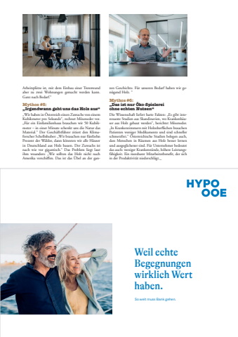 105So weit muss Bank gehen.Weil echteBegegnungenwirklich Werthaben.Arbeitspl%u00e4tze ist, mit dem Einbau einer Trennwand aber zu zwei Wohnungen gemacht werden kann. Ganz nach Bedarf.%u201cMythos #5: %u201eIrgendwann geht uns das Holz aus%u201c%u201eWir haben in %u00d6sterreich einen Zuwachs von einem Kubikmeter pro Sekunde%u201c, rechnet M%u00f6seneder vor. %u201eF%u00fcr ein Einfamilienhaus brauchen wir 50 Kubikmeter %u2013 in einer Minute schenkt uns die Natur das Material.%u201c Der Gesch%u00e4ftsf%u00fchrer zitiert den Klimaforscher Schellnhuber: %u201eWir brauchen nur f%u00fcnfzehn Prozent der W%u00e4lder, dann k%u00f6nnten wir alle H%u00e4user in Deutschland aus Holz bauen. Der Zuwachs ist nach wie vor gigantisch.%u201c Das Problem liegt laut ihm woanders: %u201eWir sollten das Holz nicht nach Amerika verschiffien. Das ist das %u00dcbel an der ganzen Geschichte. F%u00fcr unseren Bedarf haben wir gen%u00fcgend Holz. %u201cMythos #6: %u201eDas ist nur %u00d6ko-Spielerei ohne echten Nutzen%u201cDie Wissenschaft liefert harte Fakten: %u201eEs gibt interessante Studien aus Skandinavien, wo Krankenh%u00e4user aus Holz gebaut werden%u201c, berichtet M%u00f6seneder. %u201eIn Krankenzimmern mit Holzoberffl%u00e4chen brauchen Patienten weniger Medikamente und sind schneller schmerzfrei.%u201c %u00d6sterreichische Studien belegen auch, dass Menschen in R%u00e4umen aus Holz besser lernen und ausgeglichener sind. F%u00fcr Unternehmer bedeutet das auch: weniger Krankenst%u00e4nde, h%u00f6here Leistungsf%u00e4higkeit. Ein messbarer Mitarbeiterbenefft, der sich in der Produktivit%u00e4t niederschl%u00e4gt._