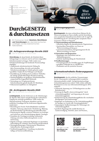 109Ein Auszug aus neuen Gesetzen, Beschl%u00fcssen und Verordnungen des ober%u00f6sterreichischen Landtages und des %u00f6sterreichischen Nationalrates.O%u00f6. Aufzugsverordnungs-Novelle 2025 LGBl. Nr. 62/2025 vom 23.07.2025Verordnung_die darauf abzielt, die Sicherheit %u00e4lterer Aufzugsanlagen zu verbessern und sie auf einen zeitgem%u00e4%u00dfen Sicherheitsstandard zu bringen. Daf%u00fcr werden neue Sicherheitsanforderungen f%u00fcr bestehende Personenaufz%u00fcge eingef%u00fchrt:%u2022 verpffl ichtende sicherheitstechnische Pr%u00fcfung f%u00fcr %u00e4ltere Personenaufz%u00fcge, die nicht nach aktuellen Sicherheitsverordnungen in Verkehr gebracht wurden%u2022 gestaffi elter Zeitplan f%u00fcr die Pr%u00fcfungen nach Baujahr%u2022 Durchf%u00fchrung der Pr%u00fcfung durch zertiff zierte Pr%u00fcfstellen f%u00fcr Aufz%u00fcge gem%u00e4%u00df Hebeanlagen-Betriebsverordnung%u2022 Nachr%u00fcstungspffl icht mit geeigneten Sicherheitsbauteilen entsprechend der festgestellten Risikostufe%u2022 Verwendung von CE-gekennzeichneten Sicherheitsbauteilen gem%u00e4%u00df aktueller EU-Richtlinien%u2022 Dokumentationspffl ichten im AufzugsbuchO%u00f6. Archivgesetz-Novelle 2025 LGBl. Nr. 60/2025 vom 23.07.2025Landesgesetz_das das Archivwesen an die Anforderungen der digitalen Welt anpasst und gleichzeitig den rechtssicheren Umgang mit Archivgut gew%u00e4hrleistet. Daf%u00fcr werden das Ober%u00f6sterreichische Archivgesetz aktualisiert und die rechtlichen Grundlagen f%u00fcr das Archivwesen folgenderma%u00dfen modernisiert: %u2022 Klarstellung des Zwecks: Nachvollziehbarkeit staatlichen Handelns, Sicherung authentischer %u00dcberlieferung, Wahrung der Rechtssicherheit und Bewahrung des kulturellen Erbes%u2022 Pr%u00e4zisierung der Begriffi e: erweiterte Deff nition von Archivgut und Archivieren unter Ber%u00fccksichtigung digitaler Unterlagen%u2022 Grunds%u00e4tze der Unterlagenverwaltung: systematische Ordnung und sichere Aufbewahrung bereits vor der Archivierung%u2022 Digitales Archivgut: umfassende Regelungen zur dauerhaften Sicherstellung der Lesbarkeit, Konvertierung und Beweiskraft%u2022 Nutzungsbestimmungen: Pr%u00e4zisierung der Schutzfristen, Auskunftsrechte, Benutzungsverfahren%u2022 Ver%u00f6ffi entlichungspffl ichten: Umstellung von physischer Auffl age auf Internetver%u00f6ffi entlichungWas gibt's NEUES?DurchGESETZt & durchzusetzen Text David Bauer Foto Gettyimages / ARMMY PICCA Quelle mit Unterst%u00fctzung des Landes O%u00d6; Beschl%u00fcsse des O%u00f6. Landtags: land-oberoesterreich.gv.at; Gesetzesbeschl%u00fcsse des Bundes: parlament.gv.atHier geht%u00b4s zu den Gesetzesbeschl%u00fcssen des Bundes.Hier geht%u00b4s zu den Beschl%u00fcssen des O%u00f6. Landtags.Datenzugangsgesetz BGBl. I Nr. 33/2025 vom 23.07.2025Bundesgesetz_das einen rechtssicheren Rahmen f%u00fcr die Weiterverwendung von Daten schaffi en und die Entwicklung eines europ%u00e4ischen Daten%u00f6kosystems f%u00f6rdern soll. Es regelt die Durchf%u00fchrung der EU-Verordnung %u00fcber europ%u00e4ische DatenGovernance (DGA) in %u00d6sterreich:#1 Datenvermittlung und Datenaltruismus:%u2022 %u00f6ffi entliches Register f%u00fcr datenaltruistische Organisationen%u2022 durchsuchbare Bestandsliste von Daten zur Weiterverwendung auf data.gv.at%u2022 automationsunterst%u00fctztes Antragsmanagement f%u00fcr die Weiterverwendung von Daten#2 Datenschutz und Kooperation:%u2022 Regelungen zum Datenschutz und zur Beh%u00f6rdenkooperation%u2022 j%u00e4hrliche Qualit%u00e4tspr%u00fcfung der Datenbest%u00e4nde#3 Strafbestimmungen:%u2022 Verwaltungsstrafen bei Verst%u00f6%u00dfen gegen die Verpffl ichtungen%u2022 gestaffi elte Geldstrafen bis zu 100.000 Euro%u2022 Strafbarkeit auch f%u00fcr juristische PersonenInformationsfreiheits-%u00c4nderungsgesetz BGBl. I Nr. 50/2025 vom 24.07.2025Bundesgesetz_das die rechtlichen Voraussetzungen f%u00fcr die Umsetzung der verfassungsrechtlich verankerten Informationsfreiheit schaffi t. Und gleichzeitig berechtigte Geheimhaltungsinteressen sch%u00fctzt. Daf%u00fcr werden zahlreiche Bundesgesetze an das neue Informationsfreiheitsgesetz (IFG) angepasst:%u2022 umfassende Anpassung von 138 Bundesgesetzen aus allen Rechtsbereichen%u2022 Ersetzung des Begriffi s %u201eAmtsverschwiegenheit%u201c durch %u201eGeheimhaltungspffl icht%u201c und Anpassung an die neuen Geheimhaltungsgr%u00fcnde %u2022 Konkretisierung der Geheimhaltungspffl ichten f%u00fcr verschiedene Berufsgruppen und Funktionstr%u00e4ger%u2022 Regelungen zur Entbindung von der Geheimhaltungspffl icht bei Aussagen vor Gericht oder Verwaltungsbeh%u00f6rden%u2022 Anpassung der Strafbestimmungen f%u00fcr Verletzungen der Geheimhaltungspffl icht%u2022 speziff sche Regelungen f%u00fcr sensible Bereiche wie Landesverteidigung, Sicherheit, Justiz und Finanzen_