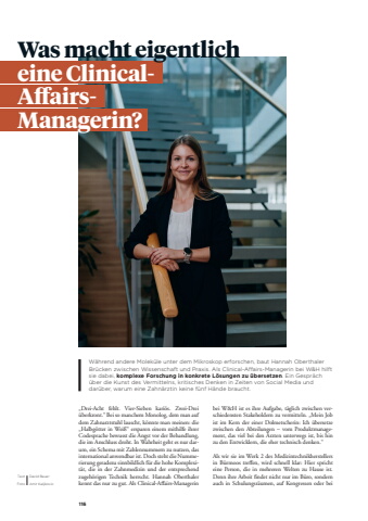 116W%u00e4hrend andere Molek%u00fcle unter dem Mikroskop erforschen, baut Hannah Oberthaler Br%u00fccken zwischen Wissenschaft und Praxis. Als Clinical-Affairs-Managerin bei W&H hilft sie dabei, komplexe Forschung in konkrete L%u00f6sungen zu %u00fcbersetzen. Ein Gespr%u00e4ch %u00fcber die Kunst des Vermittelns, kritisches Denken in Zeiten von Social Media und dar%u00fcber, warum eine Zahn%u00e4rztin keine f%u00fcnf H%u00e4nde braucht.%u201eDrei-Acht fehlt. Vier-Sieben kari%u00f6s. Zwei-Drei %u00fcberkront.%u201c Bei so manchem Monolog, dem man auf dem Zahnarztstuhl lauscht, k%u00f6nnte man meinen: die %u201eHalbg%u00f6tter in Wei%u00df%u201c ersparen einem mithilfe ihrer Codesprache bewusst die Angst vor der Behandlung, die im Anschluss droht. In Wahrheit geht es nur darum, ein Schema mit Zahlennummern zu nutzen, das international anwendbar ist. Doch steht die Nummerierung geradezu sinnbildlich f%u00fcr die hohe Komplexit%u00e4t, die in der Zahnmedizin und der entsprechend zugeh%u00f6rigen Technik herrscht. Hannah Oberthaler kennt das nur zu gut. Als Clinical-Affiairs-Managerin Text David BauerFoto Amir Kaljikovicbei W&H ist es ihre Aufgabe, t%u00e4glich zwischen verschiedensten Stakeholdern zu vermitteln. %u201eMein Job ist im Kern der einer Dolmetscherin: Ich %u00fcbersetze zwischen den Abteilungen %u2013 vom Produktmanagement, das viel bei den %u00c4rzten unterwegs ist, bis hin zu den Entwicklern, die eher technisch denken.%u201cAls wir sie im Werk 2 des Medizintechnikherstellers in B%u00fcrmoos treffien, wird schnell klar: Hier spricht eine Person, die in mehreren Welten zu Hause ist. Denn ihre Arbeit ffndet nicht nur im B%u00fcro, sondern auch in Schulungsr%u00e4umen, auf Kongressen oder bei Was macht eigentlich eine ClinicalAffairsManagerin?