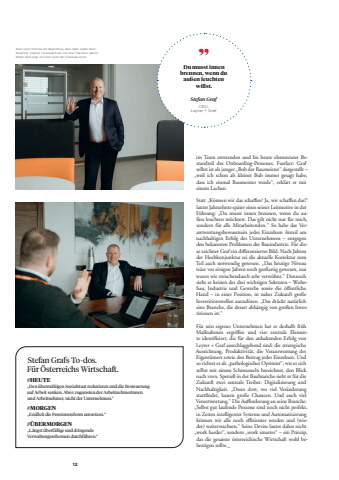 12Stefan Grafs To-dos.F%u00fcr %u00d6sterreichs Wirtschaft.#HEUTE %u201eDen %u00fcberm%u00e4%u00dfigen Sozialstaat reduzieren und die Besteuerung auf Arbeit senken. Aber: zugunsten der Arbeitnehmerinnen und Arbeitnehmer, nicht der Unternehmen.%u201c#MORGEN %u201eEndlich die Pensionsreform umsetzen.%u201c#%u00dcBERMORGEN %u201eL%u00e4ngst %u00fcberf%u00e4llige und dringende Verwaltungsreformen durchf%u00fchren.%u201cDu musst innen brennen, wenn du au%u00dfen leuchten willst.Stefan GrafCEO, Leyrer + GrafZwar noch nicht bei der Begr%u00fc%u00dfung, aber daf%u00fcr sp%u00e4ter beim Shooting: %u201eTrekkie%u201c (so bezeichnen sich Star Trek-Fans selbst) Stefan Graf zeigt uns doch noch den Vulkanier-Gru%u00df.im Team entstanden und bis heute elementarer Bestandteil des Onboarding-Prozesses. Funfact: Graf selbst ist als junger %u201eBob der Baumeister%u201c dargestellt %u2013 %u201eweil ich schon als kleiner Bub immer gesagt habe, dass ich einmal Baumeister werde%u201c, erkl%u00e4rt er mit einem Lachen.Statt %u201eK%u00f6nnen wir das schaffien? Ja, wir schaffien das!%u201c lautet Jahrzehnte sp%u00e4ter eines seiner Leitmotive in der F%u00fchrung: %u201eDu musst innen brennen, wenn du au%u00dfen leuchten m%u00f6chtest. Das gilt nicht nur f%u00fcr mich, sondern f%u00fcr alle Mitarbeitenden.%u201c So habe das Verantwortungsbewusstsein jedes Einzelnen Anteil am nachhaltigen Erfolg des Unternehmens %u2013 entgegen den bekannten Problemen der Bauindustrie. F%u00fcr diese zeichnet Graf ein diffierenziertes Bild. Nach Jahren der Hochkonjunktur sei die aktuelle Korrektur zum Teil auch notwendig gewesen. %u201eDas heutige Niveau w%u00e4re vor einigen Jahren noch gro%u00dfartig gewesen, nur waren wir zwischendurch sehr verw%u00f6hnt.%u201c Dennoch sieht er keinen der drei wichtigen Sektoren %u2013 Wohnbau, Industrie und Gewerbe sowie die %u00f6ffientliche Hand %u2013 in einer Position, in naher Zukunft gro%u00dfe Investitionswellen auszul%u00f6sen. %u201eDas dr%u00fcckt nat%u00fcrlich eine Branche, die derart abh%u00e4ngig von gro%u00dfen Investitionen ist.%u201cF%u00fcr sein eigenes Unternehmen hat er deshalb fr%u00fch Ma%u00dfnahmen ergriffien und vier zentrale Elemente identiffziert, die f%u00fcr den anhaltenden Erfolg von Leyrer + Graf ausschlaggebend sind: die strategische Ausrichtung, Produktivit%u00e4t, die Verantwortung des Eigent%u00fcmers sowie den Beitrag jedes Einzelnen. Und so richtet er als %u201epathologischer Optimist%u201c, wie er sich selbst mit einem Schmunzeln bezeichnet, den Blick nach vorn. Speziell in der Baubranche sieht er f%u00fcr die Zukunft zwei zentrale Treiber: Digitalisierung und Nachhaltigkeit. %u201eDenn dort, wo viel Ver%u00e4nderung stattffndet, lauern gro%u00dfe Chancen. Und auch viel Verantwortung.%u201c Die Auffiorderung an seine Branche: %u201eSelbst gut laufende Prozesse sind noch nicht perfekt, in Zeiten intelligenter Systeme und Automatisierung k%u00f6nnen wir alle noch eflzienter werden und (wieder) weiterwachsen.%u201c Seine Devise lautet daher nicht %u201ework harder%u201c, sondern %u201ework smarter%u201c %u2013 ein Prinzip, das die gesamte %u00f6sterreichische Wirtschaft wohl beherzigen sollte._