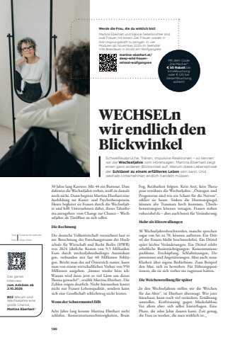 120Schwei%u00dfausbr%u00fcche, Tr%u00e4nen, impulsive Reaktionen %u2013%u00a0so kennen wir die Wechseljahre vom H%u00f6rensagen. Martina Eberhart zeigt einen ganz anderen Blickwinkel auf: Warum diese Lebensphase der Schl%u00fcssel zu einem erf%u00fcllteren Leben sein kann. Und weshalb Unternehmen endlich handeln m%u00fcssen.30 Jahre lang Karriere. Mit 44 ein Burnout. Dass dahinter die Wechseljahre stehen, wei%u00df sie damals noch nicht. Dann beginnt Martina Eberhart eine Ausbildung zur Kunst- und Psychotherapeutin. Heute begleitet sie Frauen durch die Wechseljahre und hilft Unternehmen dabei, dieses Tabuthema anzugehen: vom Change zur Chance %u2013 Wechseljahre als T%u00fcr%u00f6ffi ner zu sich selbst.Die RechnungDie deutsche Volkswirtschaft verzeichnet laut einer Berechnung des Forschungsteams der Hochschule f%u00fcr Wirtschaft und Recht Berlin (HWR) von 2024 j%u00e4hrliche Kosten von 9,5 Milliarden Euro durch wechseljahresbedingte Auswirkungen, verbunden mit fast 40 Millionen Fehltagen. Bricht man das auf %u00d6sterreich runter, kann man von einem wirtschaftlichen Verlust von 950 Millionen ausgehen. %u201eImmer wieder h%u00f6re ich: Warum wird denn jetzt so viel L%u00e4rm um dieses %u001a ema gemacht?%u201c, erz%u00e4hlt Martina Eberhart. Die Zahlen zeigen deutlich: Nicht hinzusehen kostet nicht nur Frauen Lebensqualit%u00e4t, sondern kann sich eine Gesellschaft schlichtweg nicht leisten.Wenn der Schutzmantel f%u00e4llt Acht Jahre lang konnte Martina Eberhart nicht schlafen. Konzentrationsschwierigkeiten, Brain WECHSELn wir endlich den BlickwinkelFog, Reizbarkeit folgten. Kein Arzt, kein %u001a erapeut erw%u00e4hnte die Wechseljahre. %u201e%u00d6strogen und Progesteron sind wie ein Schutz f%u00fcr die Nerven%u201c, erkl%u00e4rt sie heute. Sinken die Hormonspiegel, k%u00f6nnen alte Traumata hoch kommen. %u00dcberlebensstrategien k%u00f6nnen versagen. Frauen stehen vulnerabel da %u2013 aber auch bereit f%u00fcr Ver%u00e4nderung.Mehr als Hitzewallungen 30 Wechseljahresbeschwerden, manche sprechen sogar von bis zu 70, k%u00f6nnen auftreten. Ein Drittel der Frauen bleibt beschwerdefrei. Ein Drittel sp%u00fcrt leichte Ver%u00e4nderungen. Ein Drittel erlebt erhebliche Beeintr%u00e4chtigungen: Konzentrationsprobleme, Ersch%u00f6pfung, Schlafst%u00f6rungen, Depressionen und Angstst%u00f6rungen. Aber auch: neue Klarheit %u00fcber eigene Bed%u00fcrfnisse. Zum Beispiel den Mut, sich zu bewerben. F%u00fcr F%u00fchrungspositionen, die sie sich vorher nie zugetraut h%u00e4tten.Die Weichenstellung f%u00fcr sp%u00e4ter%u201eIn den Wechseljahren stellen wir die Weichen f%u00fcr das Alter%u201c, ist Eberhart %u00fcberzeugt. Wer jetzt hinschaut, kann noch viel ver%u00e4ndern. Ern%u00e4hrung umstellen, Krafttraining gegen Muskelabbau. Vor allem aber: sich selbst hinterfragen. Eine Phase, die zehn Jahre dauern kann. Zeit genug, die Frau zu werden, die man wirklich ist._ Text Susanna Winkelhofer Foto Antje WolmDas ganze Interview zum Anh%u00f6ren ab 2.10.2025.#22 Warum sind Wechseljahre eine gro%u00dfe Chance,Martina Eberhart?Werde die Frau, die du wirklich bist!Martina Eberhart und Sabine Gebetsroither sind zwei Frauen mit einem Ziel: Frauen wieder in ihre Ursprungskraft zu bringen. In vier Modulen ab November 2025 im Seehotel Villa Brandauer in Strobl am Wolfgangsee. martina-eberhart.at/deep-wild-frauenretreat-wolfgangsee Mit dem Code %u201eDie Macher%u201c: =C 50 Rabatt bei Einzelbuchung oder C= 120 bei Gesamtbuchung sichern!