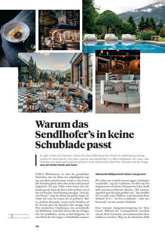 132Warum das Sendlhofer%u2019s in keine Schublade passtEs gibt Hotels f%u00fcr Familien. Hotels f%u00fcr Gesch%u00e4ftsreisende. Hotels f%u00fcr Wellnesssuchende. Hotels f%u00fcr Abenteurer. Und dann gibt es das Sendlhofer%u2019s in Bad Hofgastein. Ein Haus, das Grenzen wie diese ganz gerne ignoriert. Eine Geschichte %u00fcber Mut, Wandel und die Frage, was ein Hotel heute sein kann. Text Susanna WinkelhoferFoto Isabel Pyc, Sendlhofer'sLUKE'S Wohnzimmer. In einer der gem%u00fctlichen Sitznischen sitzt ein Mann mit aufgeklapptem Laptop, sein Blick schweift immer wieder in den Garten. Die Steckdose gleich neben ihm; da hat wohl jemand mitgedacht. Ein paar Tische weiter kostet sich eine Familie gerade durch die Karte. Jeder probiert von allem ein bisschen. Food-Sharing sozusagen. %u201eSind das echt Nieren?%u201c, fragt der Kleine mit gro%u00dfen Augen. Er w%u00fcrde sich sonst nie trauen, die zu probieren. Aber so, als kleine Kostprobe, warum nicht? Drau%u00dfen auf der Terrasse plant die Sportlerin ihre morgige Tour. Drei verschiedene Urlaubstypen, drei unterschiedliche Bed%u00fcrfnisse. Und doch sind sie alle am richtigen Ort. Im Sendlhofer%u2019s, mitten in Bad Hofgastein. Einem Hotel, das sich weigert, in Schubladen zu passen.Klassische Halbpension? Schnee von gestern!%u201eWir haben uns ziemlich bewusst gegen Schubladen entschieden%u201c, sagt Eva Goldmann. Sie f%u00fchrt das Hotel gemeinsam mit ihrem Lebenspartner Lukas Sendlhofer und dessen Schwester Martina. %u201eWir m%u00f6chten eigentlich gern f%u00fcr jeden greifbar sein.%u201c Das Sendlhofer%u2019s ist weder reines Wellness- noch klassisches Familienhotel. Es ist %u2013 wie Eva es ausdr%u00fcckt %u2013 %u201eeher eine Kommode%u201c als eine einzelne Schublade.Diese bewusste Kategorieverweigerung hat ihren Grund. W%u00e4hrend der Coronapandemie entschied sich die dritte Generation, das traditionsreiche Haus radikal zu ver%u00e4ndern. Weg von der klassischen Halb-