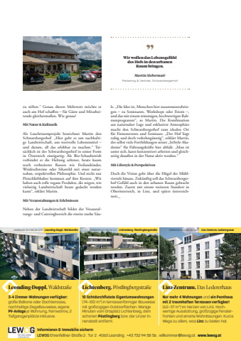 139HWBRef,SK 33 f GEE,SK 0,72 Leonding-Doppl. Waldstra%u00dfe HWBRef,SK 61 f GEE,SK 0,71 Lichtenberg. P%u00f6stlingbergstra%u00dfe Linz-Zentrum. LederergasseLeonding-Doppl. Waldstra%u00dfe3-4 Zimmer-Wohnungen verf%u00fcgbar: gro%u00dfe Balkone oder Dachterrasse, nachhaltige Ziegelbauweise, eigene PV-Anlage je Wohnung, Fernw%u00e4rme, 2 Tiefgaragenpl%u00e4tze inklusive.Lichtenberg. P%u00f6stlingbergstra%u00dfe10 lichtdurchflutete Eigentumswohnungen(74%u2013100 m2) in terrassenf%u00f6rmiger Bauweise mit gro%u00dfz%u00fcgigen Outdoorfl%u00e4chen. Wenige Minuten vom Ortsplatz Lichtenberg, dem sch%u00f6nen P%u00f6stlingberg bzw. der Linzer Innenstadt entfernt.Linz-Zentrum. Das LedererhausNur mehr 4 Wohnungen und ein Penthaus mit 2 traumhaften Terrassen verf%u00fcgbar!(62%u2013117 m2) im Herzen von Linz. Hochwertige Ausstattung, gro%u00dfz%u00fcgige Fensterfronten und smarte Wohnl%u00f6sungen. Kurze Wege zu allem, was Linz zu bieten hat. LEWOG Ehrenfellner-Stra%u00dfe 2 . T%u00fcr 2 . 4060 Leonding . +43 732 94 58 56 . willkommen@lewog.at . www.lewog.atHWBRef,SK 30 f GEE,SK 0,69Informieren & Immobilie sichern:zu stiften.%u201c Genau diesen Mehrwert m%u00f6chte er auch am Hof schaffien %u2013 f%u00fcr G%u00e4ste und Mitarbeitende gleicherma%u00dfen. Wie genau?Mit Natur & KulinarikAls Leuchtturmprojekt bezeichnet Martin den Schwarzbergerhof. %u201eHier geht es um nachhaltige Landwirtschaft, um wertvolle Lebensmittel %u2013 und darum, all das erlebbar zu machen.%u201c Tats%u00e4chlich ist der Schwarzbergerhof in seiner Form in %u00d6sterreich einzigartig: Als Bio-Schaubetrieb verbindet er die Haltung seltener, heute kaum noch verbreiteter Rassen wie Freilandrinder, Weideschweine oder Sikawild mit einer naturnahen, respektvollen Philosophie. Und nicht nur Fleischliebhaber kommen auf ihre Kosten: %u201eWir haben auch tolle vegane Produkte, die zeigen, wie vielseitig Landwirtschaft heute gedacht werden kann%u201c, erkl%u00e4rt Martin.Mit Veranstaltungen & ErlebnissenNeben der Landwirtschaft bildet der Veranstaltungs- und Cateringbereich die zweite starke S%u00e4ule. %u201eDie Idee ist, Menschen hier zusammenzubringen %u2013 zu Seminaren, Workshops oder Feiern %u2013, und das mit einem stimmigen, hochwertigen Rahmenprogramm%u201c, so Martin. Die Kombination aus naturnaher Lage und exklusiver Atmosph%u00e4re macht den Schwarzbergerhof zum idealen Ort f%u00fcr Firmenevents und Seminare. %u201eDer Hof liegt ruhig und doch verkehrsg%u00fcnstig%u201c, erkl%u00e4rt Martin, der selbst viele Fortbildungen seiner %u201eInStyle Akademie%u201c f%u00fcr F%u00fchrungskr%u00e4fte hier abh%u00e4lt. %u201eMan ist unter sich, kann konzentriert arbeiten und gleichzeitig drau%u00dfen in der Natur aktiv werden.%u201cMit Lifestyle & PerspektivenDoch die Vision geht %u00fcber die H%u00fcgel des M%u00fchlviertels hinaus. Zuk%u00fcnftig soll das Schwarzbergerhof-Gef%u00fchl auch in den urbanen Raum gebracht werden. Zuerst mit einem weiteren Standort in Ober%u00f6sterreich, in Linz, und sp%u00e4ter %u00f6sterreichweit._Wir wollen das Lebensgef%u00fchl des Hofs in den urbanen Raum bringen.Martin SiebermairMarketing & Vertrieb, Schwarzbergerhof