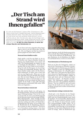 140Du sitzt am K%u00fcchentisch, Laptop offen, Smartphone in der Hand, scrollst durch Vergleichsportale, checkst Bewertungen %u2013 und bist dennoch ratlos. Trotz aller Apps und Tools f%u00fchlt sich die Suche nach der perfekten Reise pl%u00f6tzlich wie ein Fulltime-Job an. Kein Wunder also, dass die Nachfrage nach pers%u00f6nlicher Beratung steigt. Sogar Millennials buchen wieder beim Profi. Ervin Sebestyen, Gesch%u00e4ftsf%u00fchrer der Reisewelt, wei%u00df nur zu gut: Es gibt sie, diese Momente, in denen der einzige Weg der zum Reiseberater ist.%u201eDer Tisch am Strand wird Ihnen gefallen%u201cAls wir Ervin nach seiner pr%u00e4gendsten Reise fragen, z%u00f6gert er, bevor er uns eine Antwort gibt. Oder eher zwei: %u201eDie erste Flugreise mit Kind war mindestens genauso pr%u00e4gend wie meine Safari in Afrika.%u201cWenn aus Paaren Familien werdenDamit spricht er auch das erste Motiv an, das viele Menschen zum Gang ins Reiseb%u00fcro bewegt: die Planung eines Familienurlaubs. Ervin erinnert sich selbst: %u201eDer Sicherheitsaspekt; das Gep%u00e4ck, das man 17-mal checkt, ob eh alles dabei ist %u2026 Es ist eine v%u00f6llig andere Welt, als einen Urlaub zu zweit zu planen.%u201c Genau hier sieht der Reiseexperte eine der wichtigsten Phasen f%u00fcr professionelle Beratung. Wenn aus Paaren Familien werden, %u00e4ndert sich das Reiseverhalten fundamental. Vor allem, wenn es dann auch noch um eine Flugreise geht. %u201eWenn man mit dem Auto wohin f%u00e4hrt, kann man das halbe Haus mitnehmen. Aber mit einem Flugzeug, wo du auf 23 Kilo beschr%u00e4nkt bist, schaut es noch mal anders aus.%u201c Die Lebensphase, in der man erstmals mit Kind verreist, markiert oft den Punkt, an dem selbst %u00fcberzeugte Selbstorganisierer professionelle Hilfe suchen. Nicht zuletzt aus Zeitgr%u00fcnden %u2026Wenn Zeit kostbarer wird als GeldWer selbst zun%u00e4chst Kunde war, wei%u00df genau, was die Kunden brauchen. Das kann Ervin ebenfalls aus eigener Erfahrung best%u00e4tigen. Denn bei ihm war genau das der Fall. An seinen ersten Ber%u00fchrungspunkt mit der Reisewelt erinnert sich der heutige Gesch%u00e4ftsf%u00fchrer folgenderma%u00dfen: %u201eMeine damalige Freundin (und heutige Ehefrau) und ich waren beide Ende 20, beide busy working und wollten auf Urlaub fahren. Gleichzeitig hatte aber keiner von uns beiden Lust, die Wochenenden f%u00fcr die Reiseplanung aufzuwenden. So kamen wir dann zur Reisewelt.%u201c Noch bevor er im Unternehmen einstieg, konnte er also dessen Service genie%u00dfen und kennt deshalb eines der wich-%u0009 Text%u0009 Zofia WegrzeckaFoto Gettyimages / Melanie Maya; Antje Wolmtigsten Argumente, das f%u00fcr die Reiseberatung spricht: Zeit ist wertvoll. Diese Erfahrung pr%u00e4gt bis heute seine Sicht auf den Mehrwert der Reiseberatung. %u201eEin guter Reiseberater, der die Bed%u00fcrfnisse der Kundinnen und Kunden kennt, ist schon ein extremer Win.%u201cWenn Information zu %u00dcberforderung wirdNicht nur im Sinne der Zeitersparnis, sondern vor allem bei der %u00dcbersetzung von W%u00fcnschen in konkrete Reisepl%u00e4ne spielt die Reiseberatung eine hilfreiche Rolle. %u201eNat%u00fcrlich ist durch die Digitalisierung der Zugang zu Informationen viel, viel gr%u00f6%u00dfer geworden%u201c, erkl%u00e4rt Ervin. Doch genau hier liege die Krux. Denn w%u00e4hrend die Digitalisierung den Vorteil biete, Informationen mit einem Mausklick verf%u00fcgbar zu haben, gehe damit auch eine Schattenseite einher: %u201eInformation overload%u201c %u2013 die Menschen sind %u00fcberfordert. %u201eDie Informationen geh%u00f6ren verarbeitet, paketiert und auch in die pers%u00f6nlichen Bed%u00fcrfnisse %u00fcbersetzt.%u201c Passt das wirklich f%u00fcr mich und meinen Partner? F%u00fcr die Familie mit zwei Kindern? Hier ist ein Berater eine gute und vor allem vertrauensw%u00fcrdige Anlaufstelle. Wenn Sicherheit wichtiger wird als der Preis%u201eAktuell geht es den Menschen bei der Reiseplanung sehr viel um die Sicherheit%u201c, betont Ervin. Verst%u00e4rkt wurde das Sicherheitsbed%u00fcrfnis massiv durch die Pandemie. Von der ffnanziellen Absicherung bei Ausf%u00e4llen bis zur ganz konkreten Sicherheit vor Ort gibt es viele %u001aemen, bei denen Reisende verst%u00e4rkt nach vertrauensw%u00fcrdigen Quellen suchen. Da ist eine Googlebewertung oft nicht ausreichend. Der entscheidende Unterschied liegt in der pers%u00f6nlichen Erfahrung. Und diese haben Mitarbeitende der Reisewelt zur Gen%u00fcge. %u201eWenn die Reiseberaterin sagt: