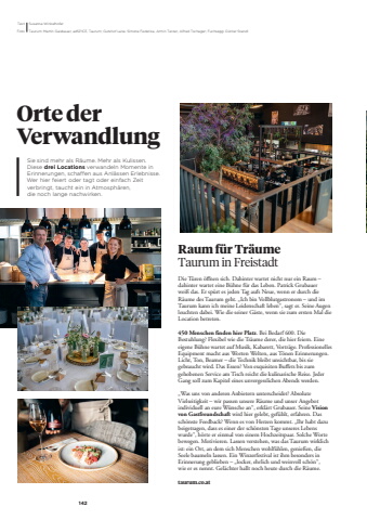 142Text Susanna WinkelhoferFoto Taurum: Martin Gaisbauer, adSPICE, Taurum; Gutshof Lana: Simone Federica, Armin Terzer, Alfred Tschager; Fuchsegg: G%u00fcnter StandlSie sind mehr als R%u00e4ume. Mehr als Kulissen. Diese drei Locations verwandeln Momente in Erinnerungen, schaffen aus Anl%u00e4ssen Erlebnisse. Wer hier feiert oder tagt oder einfach Zeit verbringt, taucht ein in Atmosph%u00e4ren, die noch lange nachwirken.Raum f%u00fcr Tr%u00e4ume Taurum in FreistadtDie T%u00fcren %u00f6ffinen sich. Dahinter wartet nicht nur ein Raum %u2013 dahinter wartet eine B%u00fchne f%u00fcr das Leben. Patrick Grubauer wei%u00df das. Er sp%u00fcrt es jeden Tag aufs Neue, wenn er durch die R%u00e4ume des Taurum geht. %u201eIch bin Vollblutgastronom %u2013 und im Taurum kann ich meine Leidenschaft leben%u201c, sagt er. Seine Augen leuchten dabei. Wie die seiner G%u00e4ste, wenn sie zum ersten Mal die Location betreten.450 Menschen finden hier Platz. Bei Bedarf 600. Die Bestuhlung? Flexibel wie die Tr%u00e4ume derer, die hier feiern. Eine eigene B%u00fchne wartet auf Musik, Kabarett, Vortr%u00e4ge. Professionelles Equipment macht aus Worten Welten, aus T%u00f6nen Erinnerungen. Licht, Ton, Beamer %u2013 die Technik bleibt unsichtbar, bis sie gebraucht wird. Das Essen? Von exquisiten Buffiets bis zum gehobenen Service am Tisch reicht die kulinarische Reise. Jeder Gang soll zum Kapitel eines unvergesslichen Abends werden. %u201eWas uns von anderen Anbietern unterscheidet? Absolute Vielseitigkeit %u2013 wir passen unsere R%u00e4ume und unser Angebot individuell an eure W%u00fcnsche an%u201c, erkl%u00e4rt Grubauer. Seine Vision von Gastfreundschaft wird hier gelebt, gef%u00fchlt, erfahren. Das sch%u00f6nste Feedback? Wenn es von Herzen kommt. %u201eIhr habt dazu beigetragen, dass es einer der sch%u00f6nsten Tage unseres Lebens wurde%u201c, h%u00f6rte er einmal von einem Hochzeitspaar. Solche Worte bewegen. Motivieren. Lassen verstehen, was das Taurum wirklich ist: ein Ort, an dem sich Menschen wohlf%u00fchlen, genie%u00dfen, die Seele baumeln lassen. Ein Winzerfestival ist ihm besonders in Erinnerung geblieben %u2013 %u201elocker, ehrlich und weinvoll sch%u00f6n%u201c, wie er es nennt. Gel%u00e4chter hallt noch heute durch die R%u00e4ume.taurum.co.atOrte der Verwandlung