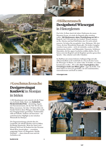 147#GeschmackssacheDesignweingut Kozlovi%u0107 in Momjan in Istrien2.200 Quadratmeter weit erstreckt sich die Vision von Architekt %u017deljko Buri%u0107: eine Kathedrale f%u00fcr den istrischen Wein %u2013 dreist%u00f6ckig, elegant, mit Panoramaterrassen, die das Vale-Tal wie eine B%u00fchne inszenieren. Seit %u00fcber 120 Jahren f%u00fchrt die Familie Kozlovi%u0107 dieses Weingut, doch 2012 wurde hier Designgeschichte geschrieben. Funktionalit%u00e4t triffit auf %u00c4sthetik, Tradition auf Innovation %u2013 ein architektonisches Highlight an der istrischen Weinstra%u00dfe bei Momjan.Die Degustationslounge schwebt %u00fcber der Landschaft, die stilvolle Weinbar wird zur B%u00fchne f%u00fcr ffl%u00fcssige Kunstwerke. Wenn der Santa Lucia Malvazija 2018 mit 96 Punkten bei den Decanter World Wine Awards gl%u00e4nzt %u2013 %u201ewunderbar ausgepr%u00e4gte Noten von Bergamotte, Marille, Haselnuss%u201c %u2013, dann schmeckt man auch die Architektur mit. kozlovic.hr#H%u00f6henrauschDesignhotel Wiesergutin HinterglemmDas Licht. Es fflutet durch die hohen Glasfronten des neuen Mountain Escape, als w%u00fcrde die Bergwelt selbst einziehen wollen. 360 Quadratmeter alpine Zur%u00fcckhaltung mit Stil im BergLoft. Seit 1350 steht hier ein Gutshof. Wiesern nannten sie ihn. Martina und Josef Kr%u00f6ll haben den Ort nicht einfach renoviert. Sie haben ihn neu gedacht. Leise. Behutsam. Mit einer Vision, die dem Wesentlichen Raum gibt. Die beiden Gastgeber verstehen Luxus anders %u2013 nicht als Lautst%u00e4rke, sondern als Stille. Einheimisches Eichen- und Walnussholz, Naturstein, Sichtbeton. Materialien, die ihre eigene Geschichte erz%u00e4hlen d%u00fcrfen. Die 24 Suiten sowie das BergLoft und die BergSuite sprechen genau diese Sprache %u2013 klar, reduziert und voller Charakter. Im BadHaus mit seinem beheizten Au%u00dfenpool f%u00fcgt sich alles selbstverst%u00e4ndlich in die Landschaft ein. Das ist der leise Luxus des Wiesergut: Er ffl%u00fcstert, wo andere rufen. Er ber%u00fchrt, wo andere beeindrucken wollen. %u201eWir wollen dem Urspr%u00fcnglichen, dem Urw%u00fcchsigen wieder eine B%u00fchne geben%u201c, sagen die Kr%u00f6lls. Und damit haben sie einen Ort geschaffien, um sich zur%u00fcckzuziehen, runterzukommen und Kraft zu tanken.wiesergut.com