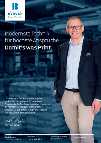 149Zentrale Horn+43 2982 4161-0B%u00fcro Wien+43 1 313 35-0Vertretungen in allen www.berger.atBundesl%u00e4ndernModernste Technik f%u00fcr h%u00f6chste Anspr%u00fcche.Damit%u2019s was Print.Ihr Peter BergerMit modernster Drucktechnologie schaffen wir Qualit%u00e4t, die begeistert. Ob individuelle Projekte oder Gro%u00dfauflagen %u2013 wir liefern Ergebnisse,die h%u00f6chsten Standards gerecht werden. Verlassen Sie sich auf Innovation und Pr%u00e4zision, wenn es wirklich darauf ankommt.