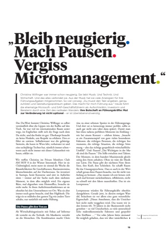 15Text Susanna WinkelhoferFoto Antje WolmDas Du-Wort kommt Christina Wilffnger so selbstverst%u00e4ndlich %u00fcber die Lippen wie der Kaffiee auf den Tisch. Sie war viel im internationalen Raum unterwegs, im Englischen stellt sich die Frage nach dem Du nicht, und das ffndet sie gut. %u00dcberhaupt braucht sie keine Floskeln, um Respekt zu erfahren. Den erf%u00e4hrt sie sowieso. Selbstbewusst war die geb%u00fcrtige Steirerin, die heute in Wien lebt, verheiratet ist und eine sechsj%u00e4hrige Tochter hat, n%u00e4mlich immer schon %u2013%u00a0wenn auch nicht immer mit dieser Gelassenheit wie heute, erkl%u00e4rt sie. Wir treffien Christina im Private Members Club AM HOF 8 in der Wiener Innenstadt. Hier ist sie Clubmitglied, meist nutzt sie einmal die Woche die R%u00e4umlichkeiten f%u00fcr Gesch%u00e4ftsessen, Businesstermine, Ideenschmieden auf der Dachterrasse. Sie investiert in Startups, ber%u00e4t Konzerne und sitzt in Aufsichtsr%u00e4ten %u2013 immer auf der Suche nach dem n%u00e4chsten Moment, in dem alles m%u00f6glich wird. Ein eigenes B%u00fcro, mal abgesehen vom Homeoflce, brauche sie nicht mehr. In ihren Aufsichtsratsfunktionen sei sie ohnehin bei den Unternehmen vor Ort. Was sie aber immer noch gerne braucht, sind ihre Highheels. Die tr%u00e4gt sie so m%u00fchelos den ganzen Tag wie andere Turnschuhe, nur nat%u00fcrlich mit mehr Haltung. Die Pause gibt den Ton an Als Wirtschaftsingenieurin mit Fokus auf Informatik versteht sie die Technik. Als Musikerin versteht sie die Menschen. Die Kombination macht ChrisBleib neugierig.Mach Pausen.Vergiss Micromanagement.%u201c%u201eChristina Wilfinger war immer schon neugierig. Sie liebt Musik. Und Technik. Und Wirtschaft. Und das alles verbindet sie. Aus der Musik hat sie viele Analogien f%u00fcr ihre F%u00fchrungsaufgaben mitgenommen. So viel vorweg: %u201eDu musst den Takt angeben, genau zuh%u00f6ren und Gestaltungsspielraum geben. Das macht f%u00fcr mich F%u00fchrung aus.%u201c Heute f%u00fchrt die ehemalige Microsoft- und SAP-Gesch%u00e4ftsf%u00fchrerin als Aufsichtsr%u00e4tin, Investorin und Beraterin durch eine Zeit des radikalen Wandels. Ihre Botschaft an F%u00fchrungskr%u00e4fte: Mut zur Ver%u00e4nderung ist nicht optional %u2013 er ist %u00fcberlebensnotwendig.tina zu einer seltenen Spezies in der F%u00fchrungsetage. Und dort sei es keineswegs immer perfekt, sollte es auch gar nicht sein (aber dazu sp%u00e4ter). Damit man hier diese nahezu perfekten Momente im Einklang %u2013 wie bei einem Konzert %u2013 erleben k%u00f6nne, %u201ebraucht es ein Zusammenspiel von ganz vielen besonderen Faktoren: die richtigen Personen, die richtigen Instrumente, die richtige Situation, die richtige Stimmung %u2013 also das richtige geopolitisch-wirtschaftliche Umfeld%u201c. Und: Pausen! %u201eDas Wichtigste in der Musik sind die Pausen.%u201c Die Stille zwischen zwei Takten. Der Moment, in dem hundert Musizierende gleichzeitig den Atem anhalten. Ohne sie w%u00e4re die Musik nur L%u00e4rm. Die Pause gibt der n%u00e4chsten Note ihren Sinn, ihre Kraft, ihre Sch%u00f6nheit. Sie schaffit Raum f%u00fcr das Unausgesprochene. Dass es auch in der Wirtschaft genau diese Pausen brauche, war ihr nicht von Anfang an bewusst. %u201eDas musste ich erst lernen: sich auch mal bewusst zur%u00fccknehmen, refflektieren, nicht zu schnell mit den Ideen rausschie%u00dfen. Das ist ein Lernprozess.%u201c Lernprozesse w%u00fcrden f%u00fcr F%u00fchrungskr%u00e4fte ohnehin dazugeh%u00f6ren. Gerade jetzt, in diesem stetigen Wandel, br%u00e4uchten sie vor allem eine ganz wesentliche Eigenschaft: %u201eDieses Annehmen, dass die Unsicherheit nicht mehr weggehen wird. Das waren wir in den letzten 60, 70 Jahren in der Businesswelt nicht gewohnt %u2013 so viel Unsicherheit, so viele unterschiedliche makro%u00f6konomische Faktoren und geopolitische Einffl%u00fcsse %u2026%u201c Vor zehn Jahren h%u00e4tte niemand f%u00fcr m%u00f6glich gehalten, dass wir %u00fcber tats%u00e4chlichen