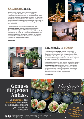 153fifffflfflffiflffl%u001a%u0019%u0019%u0018ffi%u0017%u0016%u0015%u0014%u0016%u0013%u0012%u0011%u0013%u0016%u0010%u000f%u000effiflff%u0019%u0017ffi%u000c%u000b%u0016%u0013%u0009%u0016%u0008%u0012%u0007%u0016%u0006%u0005%u0005%u0015%u0016%u0004%u0016%u0005%u0015%u0015%u0016%u0012%u0003%u0001%u0016ffffi%u0081%u008d%u001aff%u008fff%u0019%u0017ffifl%u0090ffi%u009dffi%u0019%u000e%u00a0%u00ad%u001a%u000efifififffflffifl%u001afl%u0019%u0018%u0017%u0016%u0015%u0017%u0014%u0017%u0019%u0013%u0012ffffi%u0013Ob Business- oder PrivatfeIhr individuelles CateIhrGenuss f%u00fcr jeden Anlas%u0013%u0016%u0010%u000f%u000effiflff%u0019%u0017%u00ad%u001a%u000e%u0012ffffi%u0013s- oder Privatfeier, wir kreieren ndividuelles Catering ganz nachIhren W%u00fcnschen.ss f%u00fcr n Anlass.JETZT unverbindlich f%u00fcr Ihre VeranstaltungZimmermannweg 1 anfragen! | 4064 Oftering | Tel: +43 (0) 7221 / 211 09office@haidinger-events.at | www.haidinger-events.atGenuss f%u00fcr jeden Anlass.Ob Business- oderPrivatfeier, wir kreieren Ihr individuelles Catering ganz nach Ihren W%u00fcnschen. JETZT unverbindlich f%u00fcr Ihre Veranstaltung anfragen!SALZBURG in BlauAndreas Gfrerer sammelt keine Gegenst%u00e4nde, sondern Atmosph%u00e4re. Sein Hotel Blaue Gans in der Salzburger Getreidegasse wird nach 25 Jahren zur %u201eWunderkammer%u201c, wie er es nennt. 23 renovierte Zimmer atmen jetzt freier, die Farbe Blau fflie%u00dft durch G%u00e4nge und R%u00e4ume. %u201ePlatz ist Luxus%u201c, lautet Gfrerers Motto. Christian Schwarzwalds %u00fcberdimensionale blaue Graffk im Verbindungsgang macht das Hotel zum meistfotografferten Ort der Getreidegasse.Die Two-Bedroom-Suite im obersten Stock %u00f6ffinet den Blick zum Himmel, w%u00e4hrend unten in der Getreidegasse die Touristenstr%u00f6me fflie%u00dfen. Gfrerer hat die massiven Eichenholzbetten aufpoliert statt ausgetauscht, weil Patina f%u00fcr ihn %u201edie Lachfalte der Dinge%u201c ist. Die Badezimmer %u00fcberraschen mit rostroten Mosaikffliesen als moderne Eyecatcher, die Rezeption ist zum Herbert-von-Karajan-Platz %u00fcbersiedelt und hat Raum geschaffien f%u00fcr eine gem%u00fctliche Lounge.blauegans.atEine Zeitreise in BOZENDas Goldenstern Townhouse versteckt sich zwischen gepfflasterten Gassen %u2013 vier Geb%u00e4ude aus dem Jahr 1280, die zu einem Hotel verschmolzen sind. Die Rooftopsauna %u00f6ffinet den Blick %u00fcber Bozen bis zum Rosengarten, w%u00e4hrend unten das Fr%u00fchst%u00fccksbuffiet mit regionalen Zutaten lockt. Bozen ist perfekt f%u00fcr einen Herbstspaziergang durch die Geschichte.Die sorgf%u00e4ltige Renovierung legte originale Fresken frei, bewahrte Stuckdekorationen und erhielt das %u00e4lteste Glasfenster der Stadt. Nur lokale Materialien kamen zum Einsatz %u2013 Sandstein aus Meltina, Massivholz aus der Region. Das Hotel ist Teil eines traditionellen Bozener Familienunternehmens, zu dem auch das Wirtshaus der Altstadt, die Franziskanerstuben, und die Boutiquen Rili Uomo und Rili Atelier geh%u00f6ren._goldenstern.it
