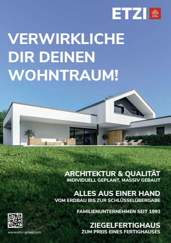 156VERWIRKLICHE DIR DEINENWOHNTRAUM! www.etzi-group.comARCHITEKTUR & QUALIT%u00c4T INDIVIDUELL GEPLANT, MASSIV GEBAUTALLES AUS EINER HANDVOM ERDBAU BIS ZUR SCHL%u00dcSSEL%u00dcBERGABEFAMILIENUNTERNEHMEN SEIT 1993ZIEGELFERTIGHAUS ZUM PREIS EINES FERTIGHAUSES