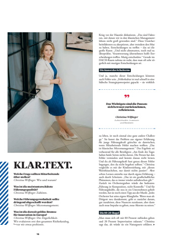 16Krieg vor der Haust%u00fcr diskutieren. %u201eDas sind Faktoren, mit denen wir in den klassischen Managementlehren nicht gro%u00df geworden sind.%u201c Diese Unsicherheitsfaktoren zu akzeptieren, aber trotzdem den Mut zu haben, Entscheidungen zu treffien %u2013%u00a0 das sei die gro%u00dfe Kunst. %u201eUnd nicht abzuwarten, noch mal zu %u00fcberpr%u00fcfen. Verantwortung %u00fcbernehmen hei%u00dft Entscheidungen treffien. Mutig entscheiden.%u201c Gerade im DACH-Raum nehme sie wahr, dass man oft sehr z%u00f6gerlich mit mutigen Entscheidungen sei. Die Kunst des Scheiterns Und ja, manche dieser Entscheidungen k%u00f6nnten auch Fehler sein. %u201eFehlerkultur ist mal schnell in eine h%u00fcbsche Strategiepowerpoint gepackt %u2013 sie wirklich zu leben, ist noch einmal eine ganz andere Challenge.%u201c Sie kennt das Problem aus eigener Erfahrung. Als junge F%u00fchrungskraft gr%u00e4tschte sie dazwischen, wenn Mitarbeitende Fehler machen wollten. %u201eDas ist klassisches Micromanagement.%u201c Das Ergebnis sei verheerend f%u00fcr alle Beteiligten: %u201eAm Ende des Tages haben beide Seiten nichts davon. Die Person hat den Fehler vermieden und konnte daraus nicht lernen. Und du als F%u00fchrungskraft hast genau diesen Fehler begangen, den du nicht begehen solltest.%u201c Christina vergleicht es mit der Kindererziehung, mit %u201ediesen Watteb%u00e4uschchen, nur damit nichts passiert%u201c. Aber echtes Lernen entstehe nur durch eigene Erfahrung %u2013 auch durch Scheitern. %u201eDas ist ein gesellschaftliches Ph%u00e4nomen, das es immer wieder aufzubrechen gilt.%u201cZur%u00fcck im Orchestergraben w%u00fcrde das bedeuten: %u201eF%u00fchrung ist Komposition, nicht Kontrolle.%u201c Und f%u00fcr F%u00fchrungskr%u00e4fte, die neu in ein Unternehmen geholt werden, hat sie noch einen Tipp aus der Musik: %u201eJedes Orchester hat seine eigene Klangfarbe. Wenn man als Dirigent neu dazukommt, geht es zun%u00e4chst darum, gut zuzuh%u00f6ren, diese Nuancen zuzulassen, aber dann auch neue Impulse zu geben, neue Akzente zu setzen.%u201c Die 80-20-Regel %u201eMan muss sich oft mit 80 Prozent zufrieden geben und 20 Prozent Improvisation zulassen.%u201c Christina sagt das, als w%u00fcrde sie ein Naturgesetz erkl%u00e4ren. Das Wichtigste sind die Pausen: sich bewusst zur%u00fccknehmen, reflektieren.Christina WilfingerAufsichtsr%u00e4tin, Investorin und BeraterinKLAR.TEXT.Welche Frage sollten Mitarbeitende %u00f6fter stellen?Christina Wilfinger: Wie und warum?Was ist die meistuntersch%u00e4tzte F%u00fchrungsqualit%u00e4t?Christina Wilfinger: Zuh%u00f6ren.Welche F%u00fchrungsgewohnheit sollte dringend abgeschafft werden?Christina Wilfinger: Micromanagement. Was ist die derzeit gr%u00f6%u00dfte Bremse f%u00fcr Innovation in Europa?Christina Wilfinger: Die Z%u00f6gerlichkeit. Wir evaluieren erst den gesamten Risikokatalog, bevor wir etwas probieren.