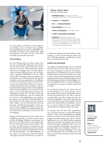 23aus vielen gr%u00f6%u00dferen und kleineren Notwendigkeiten und Vorhaben. Denn der Bedarf nach Logistikffl %u00e4chen und Parkpl%u00e4tzen war gro%u00df. Gesch%u00e4ftsf%u00fchrer Andreas Fill, ein Vision%u00e4r, wie er im Buche steht, ergriffi die Gelegenheit und machte aus dem Power Cube ein Projekt, das sich sehen lassen kann.Oase im Gr%u00fcnenBei einer F%u00fchrung durch die oberste Ebene k%u00f6nnen wir uns gleich selbst %u00fcberzeugen. Wir nehmen den Lift, treten durch eine T%u00fcr und stehen auf einmal mitten auf einer 1.000 Quadratmeter gro%u00dfen Dachterrasse. Unz%u00e4hlige Gr%u00e4ser und hohe B%u00e4ume, violette und blaue Blumen s%u00e4umen die mit Kieselsteinen ausgelegten Pffl anzffl %u00e4chen und unser Blick schweift %u00fcber die Region. Kaum zu glauben, aber wir beff nden uns in 20 Metern H%u00f6he. F%u00fcr 60 Mitarbeitende, die die neu geschaffi enen Arbeitsffl %u00e4chen im selben Stockwerk bereits nutzen, bietet die Dachterrasse eine sonnige Fl%u00e4che f%u00fcr Pausen im Gr%u00fcnen %u2013%u00a0%u201eund f%u00fcr die eine oder andere Firmenfeier%u201c, sagt Andreas Fill und lacht. Apropos Feier: Dass das geplante Lokal f%u00fcr unterschiedlichste Events genutzt werden kann, ist nicht nur f%u00fcr die Menschen in Gurten und Umgebung ein gro%u00dfes Plus. Die Idee entstand aus einem gewissen Eigennutz, verr%u00e4t uns Andreas Fill, da es im Ort wenig M%u00f6glichkeiten zum Ausgehen gibt. Warum also nicht f%u00fcr die Mitarbeitenden und die Menschen aus der Region ein neues Gastroerlebnis schaffi en, von dem alle proff tieren? Auch die Kosmetik- und Physiotherapieangebote sind f%u00fcr externe Personen zug%u00e4nglich. Der Yoga- sowie der Fitnessraum stehen wiederum den Mitarbeitenden und ihren Partnerinnen und Partnern rund um die Uhr zur Verf%u00fcgung. %u00dcbrigens: Beim Bau des Power Cubes wurden mehr Gr%u00fcnffl %u00e4chen geschaffi en, als verbaut wurden. Denn auf dem ehemaligen Parkplatz entsteht gerade ein Bee-O Lab. Der Weg ist in Form einer Wabe angelegt. Der bestehende Schotter wurde zerkleinert und es w%u00e4chst eine Blumenwiese, die erg%u00e4nzend zu den bereits bestehenden Lernlaboren des Future Labs f%u00fcr Sch%u00fclerinnen und Sch%u00fcler als Bionikstation dienen soll. Mit Bienenst%u00f6cken und Imkert%u00e4tigkeiten vor Ort m%u00f6chte man Natur und Technik verbinden. %u201eWir fragen uns immer: Wie k%u00f6nnen wir nicht nur den Status quo erhalten, sondern die n%u00e4chsten Schritte gehen?%u201c, so Fill. Und der Erfolg des Future Labs mit 12.000 Besucherinnen und Besuchern in den letzten vier Jahren gibt ihm recht.Schlicht, aber spektakul%u00e4rDie gr%u00f6%u00dften Herausforderungen bei der Planung und beim Bau des Power Cubes? Einerseits der relativ weiche Untergrund, andererseits die Genehmigung, %u00fcber die Gemeindestra%u00dfe zu bauen. Doch die Gemeinder%u00e4tinnen und Gemeinder%u00e4te waren sofort an Bord. Und auch die Eigent%u00fcmerfamilie, die F%u00fchrungsmannschaft und der Aufsichtsrat gaben schnell ihre Zustimmung. Im Sinne der Nachhaltigkeit wurden alle verf%u00fcgbaren Fl%u00e4chen mit Photovoltaikpaneelen ausgestattet, um so gut wie m%u00f6glich energieautark zu werden.Der gestalterische Anspruch von Andreas Fill und seinem Architekten ist es, zeitlos zu bauen. Mit einem Design, das sich nicht in ein Jahrzehnt einordnen l%u00e4sst; das hochwertig ist, aber ohne zu protzen. %u201eEs soll schlicht sein, aber trotzdem auf seine Art und Weise spektakul%u00e4r.%u201c Die gro%u00dfen Fensterfronten in den neuen B%u00fcros zieren bunte Graff ken, die sich auch auf der Mitarbeiterkarte wiederff nden, entworfen von Andreas%u2019 Bruder. Sie haben einen Wiedererkennungswert und bringen Farbe in die G%u00e4nge.Der gesamte Bau soll Ende 2025 abgeschlossen sein. Und schon schwirren in Andreas Fills Kopf die n%u00e4chsten Visionen. Der Weiterbetrieb der f%u00fcnfzehn Stationen im Future Lab, die f%u00fcr Schulen und Kinderg%u00e4rten kostenlos nutzbar sind und die vielleicht irgendwann in eine Next World Academy ausgebaut werden; eine erweitere Lehrwerkst%u00e4tte, die man auch anderen Unternehmen zug%u00e4nglich macht; und, wenn es nach den gro%u00dfen Tr%u00e4umen geht: eine eigene zweisprachige Schule mit technischem Fokus als Vorbereitung auf eine h%u00f6here Ausbildung. Das ist zwar noch Zukunftsmusik, aber wer Fill kennt, der wei%u00df: Sind erst mal die T%u00f6ne im Kopf, entsteht schon bald eine Sinfonie._Das ganze Interview zum Anh%u00f6ren ab 8.10.2025.#203 Wie schafft man als Unternehmen einen Mehrwert f%u00fcr die gesamte Region, Andreas Fill?Facts, facts, facts%u00fcber den Fill Power Cube%u2022 29 Millionen Euro Investitionsvolumen %u2013 die gr%u00f6%u00dfte Investition in der Firmengeschichte%u2022 6 Ebenen und 30.000 m2%u2022 120 neue B%u00fcroarbeitspl%u00e4tze%u2022 650 Stellpl%u00e4tze im Parkhaus %u2022 1.000 m2 Dachgarten in 20 Metern H%u00f6he%u2022 11.000 m2 geschaffene Gr%u00fcnfl%u00e4che%u2022 Angebote neben den Logistik- und B%u00fcrofl%u00e4chen: Physiotherapeut, Yoga- sowie Fitnessraum, ein Friseur und ein Lokal, das vom Public Viewing bis zum DJ-Event und vom Sound der 1980er bis zur coolen Disco unz%u00e4hlige M%u00f6glichkeiten bietet