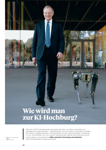 24Mehr als 2.000 KI-Studierende, internationale Stars wie Sepp Hochreiter und erfolgreiche Ausgr%u00fcndungen %u2013 Ober%u00f6sterreich will es wirklich: KI-Hochburg werden. Wir treffen Landeshauptmann Thomas Stelzer an der Johannes Kepler Universit%u00e4t in Linz. Und erfahren von ihm, warum internationale Talente mehr brauchen als ein hohes Gehalt und weshalb die N%u00e4he zwischen Forschung und Industrie den entscheidenden Vorsprung bringt.Text Susanna WinkelhoferFoto Antje WolmWie wird man zur KI-Hochburg?