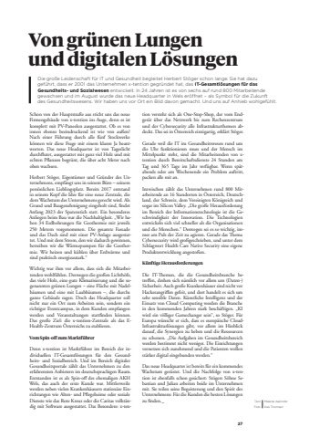 27Die gro%u00dfe Leidenschaft f%u00fcr IT und Gesundheit begleitet Herbert St%u00f6ger schon lange. Sie hat dazu gef%u00fchrt, dass er 2001 das Unternehmen x-tention gegr%u00fcndet hat, das IT-Gesamtl%u00f6sungen f%u00fcr das Gesundheits- und Sozialwesen entwickelt. In 24 Jahren ist es von sechs auf rund 800 Mitarbeitende gewachsen und im August wurde das neue Headquarter in Wels er%u00f6ffnet %u2013 als Symbol f%u00fcr die Zukunft des Gesundheitswesens. Wir haben uns vor Ort ein Bild davon gemacht. Und uns auf Anhieb wohlgef%u00fchlt.Schon von der Hauptstra%u00dfe aus sticht uns das neue Firmengeb%u00e4ude von x-tention ins Auge, denn es ist komplett mit PV-Paneelen ausgestattet. Ob es von innen ebenso beeindruckend ist wie von au%u00dfen? Nach einer F%u00fchrung durch alle f%u00fcnf Stockwerke k%u00f6nnen wir diese Frage mit einem klaren Ja beantworten. Das neue Headquarter ist von Tageslicht durchfflutet, ausgestattet mit ganz viel Holz und mit echten Pfflanzen begr%u00fcnt, die %u00fcber acht Meter nach oben wachsen.Herbert St%u00f6ger, Eigent%u00fcmer und Gr%u00fcnder des Unternehmens, empf%u00e4ngt uns in seinem B%u00fcro %u2013 seinem pers%u00f6nlichen Lieblingsplatz. Bereits 2017 entstand in seinem Kopf die Idee f%u00fcr eine neue Zentrale, die dem Wachstum des Unternehmens gerecht wird. Als Grund und Baugenehmigung eingeholt sind, ffndet Anfang 2023 der Spatenstich statt. Ein besonderes Anliegen beim Bau war die Nachhaltigkeit. %u201eWir haben 34 Erdbohrungen f%u00fcr Geothermie mit jeweils 250 Metern vorgenommen. Die gesamte Fassade und das Dach sind mit einer PV-Anlage ausgestattet. Und mit dem Strom, den wir dadurch gewinnen, betreiben wir die W%u00e4rmepumpen f%u00fcr die Geothermie. Wir heizen und k%u00fchlen %u00fcber Erdw%u00e4rme und sind praktisch energieautark.%u201cWichtig war ihm vor allem, dass sich die Mitarbeitenden wohlf%u00fchlen. Deswegen die gro%u00dfen Lichth%u00f6fe, das viele Holz, eine gute Klimatisierung und die sogenannten gr%u00fcnen Lungen %u2013 eine Fl%u00e4che mit Nadelb%u00e4umen und eine mit Laubb%u00e4umen %u2013, die durchs ganze Geb%u00e4ude ragen. Doch das Headquarter soll nicht nur ein Ort zum Arbeiten sein, sondern ein richtiger Eventcampus, in dem Kunden empfangen werden und Veranstaltungen stattffnden k%u00f6nnen. Das gro%u00dfe Ziel: die x-tention-Zentrale als das EHealth-Zentrum %u00d6sterreichs zu etablieren.Vom Spin-off zum Marktf%u00fchrerDenn x-tention ist Marktf%u00fchrer im Bereich der individuellen IT-Gesamtl%u00f6sungen f%u00fcr den Gesundheits- und Sozialbereich. Und im Bereich digitaler Gesundheitsportale z%u00e4hlt das Unternehmen zu den erfahrensten Anbietern im deutschsprachigen Raum. Entstanden ist es als Spin-offi des ehemaligen AKH Wels, das auch der erste Kunde war. Mittlerweile werden neben vielen Krankenh%u00e4usern station%u00e4re Einrichtungen wie Alten- und Pfflegeheime oder soziale Dienste wie das Rote Kreuz oder die Caritas vollst%u00e4ndig mit Software ausgestattet. Das Besondere: x-tenText Melanie KashoferFoto Ines ThomsenVon gr%u00fcnen Lungen und digitalen L%u00f6sungention versteht sich als One-Stop-Shop, der vom Endger%u00e4t %u00fcber das Netzwerk bis zum Rechenzentrum und der Cybersecurity alle Infrastrukturthemen abdeckt. Das sei in %u00d6sterreich einzigartig, erkl%u00e4rt St%u00f6ger.Gerade weil die IT im Gesundheitswesen rund um die Uhr funktionieren muss und der Mensch im Mittelpunkt steht, sind die Mitarbeitenden von xtention durch Bereitschaftsdienste 24 Stunden am Tag und 365 Tage im Jahr verf%u00fcgbar. Wenn sp%u00e4tabends oder am Wochenende ein Problem auftritt, packen alle mit an.Inzwischen z%u00e4hlt das Unternehmen rund 800 Mitarbeitende an 16 Standorten in %u00d6sterreich, Deutschland, der Schweiz, dem Vereinigten K%u00f6nigreich und sogar im Silicon Valley. %u201eDie gro%u00dfe Herausforderung im Bereich der Informationstechnologie ist die Geschwindigkeit der Innovation. Die Technologien entwickeln sich viel schneller als die Organisationen und die Menschen.%u201c Deswegen sei es so wichtig, immer am Puls der Zeit zu agieren. Gerade das %u001aema Cybersecurity wird gro%u00dfgeschrieben, und unter dem Schlagwort Health Care Native Security eine eigene Produktentwicklung angesto%u00dfen.K%u00fcnftige HerausforderungenDie IT-%u001aemen, die die Gesundheitsbranche betreffien, drehen sich n%u00e4mlich vor allem um (Daten-)Sicherheit. Auch gro%u00dfe Krankenh%u00e4user sind nicht vor Hackerangriffien gefeit, und dort handelt es sich um sehr sensible Daten. K%u00fcnstliche Intelligenz und der Einsatz von Cloud Computing werden die Branche in den kommenden Jahren stark besch%u00e4ftigen. %u201eKI wird ein v%u00f6lliger Gamechanger sein%u201c, so St%u00f6ger. F%u00fcr Europa w%u00fcnscht er sich, dass es europ%u00e4ische CloudInfrastrukturl%u00f6sungen gibt, vor allem im Hinblick darauf, die Synergien zu heben und die Ressourcen zu schonen. %u201eDie Aufgaben im Gesundheitsbereich werden bestimmt nicht weniger. Die Einrichtungen vernetzen sich zunehmend und die Patienten wollen st%u00e4rker digital eingebunden werden.%u201c Das neue Headquarter ist bereits f%u00fcr ein kommendes Wachstum ger%u00fcstet. Und die Nachfolge von x-tention ist ebenfalls schon gesichert: St%u00f6gers S%u00f6hne Sebastian und Julian arbeiten beide im Unternehmen mit. Sie teilen seine Begeisterung und den Spirit des Unternehmens: F%u00fcr die Kunden die besten L%u00f6sungen zu ffnden._