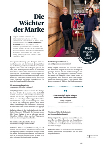 29 Text Melanie Kashofer Foto Antje WolmDie W%u00e4chter der Marke WIEmacht ihr das?T%u00e4glich str%u00f6mt eine Flut an Informationen auf uns ein. Wie k%u00f6nnen sich Botschaften in dieser Zeit differenzieren und echte Emotionen ausl%u00f6sen? Dazu braucht es noch immer Expertinnen und Experten, die wissen, worauf es bei der erfolgreichen Kommunikation und dem Markenaufbau ankommt. Wir haben mit zwei von ihnen gesprochen und gefragt: Wie macht ihr das?Eines gleich mal vorweg: %u201eDie Prinzipien der Kommunikation sind seit der Steinzeit gleichgeblieben, nur die Werkzeuge %u00e4ndern sich.%u201c Das Team hinter der Agentur Lunik2 hat es sich zur Aufgabe gemacht, mit eben jenen Werkzeugen Botschaften zu entwickeln, die Relevanz haben. Daf%u00fcr m%u00fcssen sie vor allem authentisch sein. Gesch%u00e4ftsf%u00fchrer Harry Kriegner und Agenturleiterin Katharina Lehner empfangen uns bei Kaffi ee und Schokolade in ihrem bunten B%u00fcro in der Linzer Tabakfabrik und geben Einblicke in die Zukunft der Branche und ihre Expertise.Wie hat sich eure Branche im vergangenen Jahrzehnt ver%u00e4ndert?Harry Kriegner: Alles hat sich ver%u00e4ndert. Ein Kollege, der schon 20 Jahre da ist, meinte, er hat das Gef%u00fchl, als h%u00e4tte er in dieser Zeit bereits bei zehn Firmen gearbeitet, weil sich die T%u00e4tigkeiten so stark ver%u00e4ndert haben. Die Technologie hat Einzug gehalten und die handwerklichen Dinge, wie Freistellung oder Lektorat, sind in den Hintergrund geraten. Nicht zuletzt haben Entwicklungen wie Performance Marketing, KI oder andere Tools die Art der Arbeit stark gepr%u00e4gt.Katharina Lehner: In der Marketingbranche hat sich dar%u00fcber hinaus die Wichtigkeit der Strategie gewandelt. Unsere Aufgabe ist es, zu erkennen, was die Menschen wirklich wollen, was ihre Triggerpoints sind, und diese strategisch zu erkunden.Wie stellt ihr sicher, dass ihr bei diesen neuen Entwicklungen am Ball bleibt?Katharina Lehner: Es braucht Mitarbeitende, die sich wirklich f%u00fcr diese neuen Arbeitsweisen interessieren und begeistern k%u00f6nnen. Wir arbeiten in Projektteams, die gewisse Technologien evaluieren, und dann die restliche Mannschaft an Bord holen. So muss nicht jeder individuell Recherchearbeit betreiben.Welche F%u00e4higkeiten braucht es, um erfolgreich zu kommunizieren?Harry Kriegner: Verst%u00e4ndnis f%u00fcr Menschen und deren Bed%u00fcrfnisse. Es geht nicht darum, ein m%u00f6glichst g%u00fcnstiges Produkt auf den Markt zu bringen, sondern um die psychologischen Momente dahinter. Es braucht die F%u00e4higkeit, diese Essenz kreativ zu interpretieren. Eine Botschaft bleibt dann h%u00e4ngen, wenn man Emotionen sp%u00fcrt. Unser Antrieb dabei ist es, sozusagen als W%u00e4chter der Marke zu agieren.Was ist eure Vision f%u00fcr die Zukunft der Kommunikationsbranche?Harry Kriegner: Die Agenturen werden kleiner sein, aber %u00fcber eine h%u00f6here Expertise und Spezialisierung verf%u00fcgen. Die Grundpfeiler der Kommunikation %u2013 die Relevanz und die Authentizit%u00e4t %u2013 werden vermutlich noch wichtiger.Katharina Lehner: Der Mensch und seine Bed%u00fcrfnisse bleiben weiterhin im Mittelpunkt %u2013 nur die Werkzeuge %u00e4ndern sich._Eine Botschaft bleibt h%u00e4ngen, wenn man Emotionen sp%u00fcrt.Harry KriegnerGesch%u00e4ftsf%u00fchrer, Lunik2