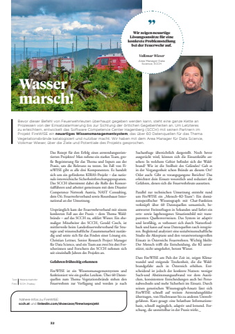 32Wasser marsch!Bevor dieser Befehl von Feuerwehrleuten %u00fcberhaupt gegeben werden kann, steht eine ganze Kette an Prozessen von der Einsatzalarmierung bis zur Sichtung der %u00f6rtlichen Gegebenheiten an. Um Letzteres zu erleichtern, entwickelt das Software Competence Center Hagenberg (SCCH) mit seinen Partnern im Projekt FireWISE ein neuartiges Wissensmanagementsystem, das %u00fcber 60 Datenquellen f%u00fcr das Thema Vegetationsbr%u00e4nde katalogisiert und nutzbar macht. Wir haben mit dem Area Manager f%u00fcr Data Science, Volkmar Wieser, %u00fcber die Ziele und Potentiale des Projekts gesprochen. Text Melanie Kashofer Foto SCCH, PixabayDas Rezept f%u00fcr den Erfolg eines anwendungsorientierten Projektes? Man nehme ein starkes Team, gro%u00dfe Begeisterung f%u00fcr das %u001a ema und Inputs aus der Praxis, um die Relevanz zu testen. Im Fall von FireWISE gibt es alle drei Komponenten. Es handelt sich um ein gef%u00f6rdertes KIRAS-Projekt %u2013 das nationale %u00f6sterreichische Sicherheitsforschungsprogramm. Das SCCH %u00fcbernimmt dabei die Rolle des Konsortialf%u00fchrers und arbeitet gemeinsam mit dem Disaster Competence Network Austria, NAST Consulting, dem O%u00f6. Feuerwehrverband sowie Rosenbauer International an der Umsetzung.Urspr%u00fcnglich kam der Feuerwehrverband mit einem konkreten Fall aus der Praxis %u2013 dem %u001a ema Waldbr%u00e4nde %u2013 auf das SCCH zu, erkl%u00e4rt Wieser. Ein ehemaliger Mitarbeiter des SCCH, Gerald Czech, ist mittlerweile beim Landesfeuerwehrverband f%u00fcr Strategie und wissenschaftliche Zusammenarbeit zust%u00e4ndig und setzte sich f%u00fcr das Finden einer L%u00f6sung ein. Christian Lettner, Senior Research Project Manager f%u00fcr Data Science, und ein Team aus zwei bis drei Forscherinnen und Forschern des SCCH nehmen sich seit eineinhalb Jahren des Projekts an.Gefahren fr%u00fchzeitig erkennenFireWISE ist ein Wissensmanagementsystem und funktioniert wie ein gro%u00dfes Lexikon. %u00dcber 60 Datenquellen zum %u001a ema Vegetationsbr%u00e4nde stehen den Feuerwehren zur Verf%u00fcgung und werden je nach Suchanfrage %u00fcbersichtlich dargestellt. Noch bevor ausger%u00fcckt wird, k%u00f6nnen sich die Einsatzkr%u00e4fte ansehen: In welchem Gebiet beff ndet sich der Waldbrand? Wie ist die Steilheit des Gel%u00e4ndes? Gab es in der Vergangenheit schon Br%u00e4nde an diesem Ort? Oder auch: Gibt es vorangegangene Berichte? Das erleichtert dein Einsatz wesentlich und reduziert die Gefahren, denen sich die Feuerwehrleute aussetzen.Parallel zur technischen Umsetzung entsteht rund um FireWISE ein %u201eMensch%u2013KI-Team%u201c: Ein dom%u00e4nenspeziff scher Wissensgraph mit Chat-Funktion verkn%u00fcpft %u00fcber 60 Datenquellen semantisch, beantwortet Freitextfragen in Sekunden und liefert ein orts- sowie lagebezogenes Situationsbild mit transparenten Quellenverweisen. Das System ist adaptiv und lernf%u00e4hig, es verbessert sich durch Nutzerfeedback und kann auf neue Datenquellen rasch integrieren. Begleitend analysiert eine sozialwissenschaftliche Studie die Akzeptanz und den verantwortungsvollen Einsatz in %u00d6sterreichs Feuerwehren. Wichtig bleibt: Der Mensch triffi t die Entscheidung, die KI unterst%u00fctzt, nicht umgekehrt, betont Wieser.Dass FireWISE am Puls der Zeit ist, zeigen Klimawandel und steigende Trockenheit, die die Waldbrandgefahr auch in %u00d6sterreich erh%u00f6hen. Entscheidend ist jedoch der konkrete Nutzen: weniger Such-und Abstimmungsaufwand vor dem Ausr%u00fccken, konsistentere Entscheidungen auch bei Personalwechseln und mehr Sicherheit im Einsatz. Durch seinen generischen Wissensgraph-Ansatz l%u00e4sst sich FireWISE schnell auf weitere Anwendungsfelder %u00fcbertragen, von Hochwasser bis zu anderen Umweltgefahren. Kurz gesagt: eine belastbare Informationsbasis, schnell zug%u00e4nglich, adaptiv und lernend. Forschung, die unmittelbar in der Praxis wirkt._Wir zeigen neuartige L%u00f6sungsans%u00e4tze f%u00fcr eine konkrete Problemstellung bei der Feuerwehr auf.Volkmar WieserArea Manager Data Science, SCCHN%u00e4here Infos zu FireWISE: scch.at und linkedin.com/showcase/firewiseprojekt