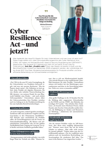 33%u201eWas bedeutet das neue EU-Gesetz f%u00fcr mein Unternehmen und was muss ich jetzt tun?%u201c Diese Frage stellen sich viele F%u00fchrungskr%u00e4fte angesichts des Cyber Resilience Acts (CRA). Wir haben mit Michael Brunner, Head of Security Engineering bei CERTAINITY,gesprochen. Der Experte f%u00fcr Cybersecurity teilt mit uns seine To-do-Liste f%u00fcr Unternehmen. Sein Rat: %u201eProaktiv sein.%u201c Denn das Gesetz ist bereits in Kraft und die Berichtspflichten m%u00fcssen bis September 2026 umgesetzt werden, der vollst%u00e4ndige Act bis Ende 2027. Die Ziele: Mindestsicherheitsstandards f%u00fcr Produkte schaffen und eine effiziente Behandlung von Schwachstellen erm%u00f6glichen. #1 Betroffenheit kl%u00e4ren %u201eDer CRA ist die erste EU-weite Gesetzgebung, die die Cybersicherheit von Produkten horizontal regelt, und zwar mit enormer Reichweite.%u201c Was der Experte damit meint? %u201eDie Deff nition ist breit gefasst: Jedes Produkt mit digitalen Elementen, das eine direkte oder indirekte Datenverbindung hat, f%u00e4llt darunter: von meinem Handy bis zum Bluetooth-Teddyb%u00e4r eines Kindes %u2013 und auch einfach Softwareprodukte.%u201c Unternehmen m%u00fcssen daher die Cybersecurityrisiken ihrer Produkte verstehen und von Anfang an in der Produktentwicklung bis hin zum laufenden Betrieb ber%u00fccksichtigen. #2 L%u00fccken identifizieren %u201eEs macht wenig Sinn, einfach irgendwo anzufangen. Stattdessen sollte man strukturiert vorgehen und eine Gap-Analyse in drei Dimensionen durchf%u00fchren.%u201c Drei Bereiche seien entscheidend: die Produkte selbst, der Entwicklungsprozess und der Prozess zur Schwachstellenbehandlung. %u201eBei kleinen und mittelst%u00e4ndischen Unternehmen sehe ich den gr%u00f6%u00dften Nachholbedarf beim Umgang mit Letzterem, da viele hierf%u00fcr noch keine Strukturen geschaffi en haben.%u201c #3 Entwicklungsprozesse optimieren ist keine Raketenwissenschaft %u201eStreng genommen wird nichts gefordert, was nicht l%u00e4ngst Stand der Technik sein sollte.%u201c Brunner betont, dass es sich um Mindeststandards handelt. %u201eDas zentrale Element ist das verpffl ichtende CyberRisk-Assessment f%u00fcr jedes Produkt. Unternehmen m%u00fcssen sich konkret mit den Bedrohungen auseinandersetzen und diese in der Entwicklung bedenken. Nicht erst, wenn es jemandem auffi %u00e4llt.%u201c #4 Schwachstellenmanagement etablieren %u201eEine gro%u00dfe Challenge ist die 24-Stunden-Frist f%u00fcr die Meldung aktiv ausgenutzter Schwachstellen an die ENISA und das CSIRT, also Beh%u00f6rden des jeweiligen EU-Landes.%u201c Das erfordere klare Strukturen: %u201eEs braucht einen Disclosure-Prozess, damit Kunden oder Forscher Schwachstellen melden k%u00f6nnen, die Bef%u00e4higung zur Analyse und Ressourcen zur Behebung %u2013 idealerweise mit automatisierten Securityupdates.%u201c #5 Konformit%u00e4t nachweisen & langfristig denken %u201eF%u00fcr die meisten Produkte reicht ein Self-Assessment, aber dieses muss sorgf%u00e4ltig dokumentiert sein.%u201c Brunner warnt davor, dies auf die leichte Schulter zu nehmen: %u201eMan sollte nicht warten, bis jemand anklopft.%u201c Zudem m%u00fcsse man das Gesch%u00e4ftsmodell anpassen: %u201eDer Act verpffl ichtet unter anderem auch zur kostenfreien Bereitstellung von Securityupdates f%u00fcr mindestens f%u00fcnf Jahre. Das muss in den Business Case eingerechnet werden.%u201c_ Text David Bauer Foto PicturePeople InnsbruckCyber Resilience Act %u2013 und jetzt?!Das Niveau f%u00fcr die Cybersicherheit vernetzter Produkte war in der EU lange zu niedrig.Michael BrunnerHead of Security Engineering, CERTAINITY