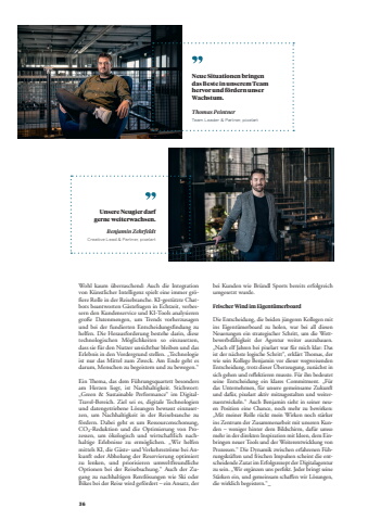 36Wohl kaum %u00fcberraschend: Auch die Integration von K%u00fcnstlicher Intelligenz spielt eine immer gr%u00f6%u00dfere Rolle in der Reisebranche. KI-gest%u00fctzte Chatbots beantworten G%u00e4stefragen in Echtzeit, verbessern den Kundenservice und KI-Tools analysieren gro%u00dfe Datenmengen, um Trends vorherzusagen und bei der fundierten Entscheidungsffndung zu helfen. Die Herausforderung bestehe darin, diese technologischen M%u00f6glichkeiten so einzusetzen, dass sie f%u00fcr den Nutzer unsichtbar bleiben und das Erlebnis in den Vordergrund stellen. %u201eTechnologie ist nur das Mittel zum Zweck. Am Ende geht es darum, Menschen zu begeistern und zu bewegen.%u201cEin %u001aema, das dem F%u00fchrungsquartett besonders am Herzen liegt, ist Nachhaltigkeit. Stichwort: %u201eGreen & Sustainable Performance%u201c im DigitalTravel-Bereich. Ziel sei es, digitale Technologien und datengetriebene L%u00f6sungen bewusst einzusetzen, um Nachhaltigkeit in der Reisebranche zu f%u00f6rdern. Dabei geht es um Ressourcenschonung, CO2-Reduktion und die Optimierung von Prozessen, um %u00f6kologisch und wirtschaftlich nachhaltige Erlebnisse zu erm%u00f6glichen. %u201eWir helfen mittels KI, die G%u00e4ste- und Verkehrsstr%u00f6me bei Ankunft oder Abholung der Reservierung optimiert zu lenken, und priorisieren umweltfreundliche Optionen bei der Reisebuchung.%u201c Auch der Zugang zu nachhaltigen Rentl%u00f6sungen wie Ski oder Bikes bei der Reise wird gef%u00f6rdert %u2013 ein Ansatz, der bei Kunden wie Br%u00fcndl Sports bereits erfolgreich umgesetzt wurde.Frischer Wind im Eigent%u00fcmerboardDie Entscheidung, die beiden j%u00fcngeren Kollegen mit ins Eigent%u00fcmerboard zu holen, war bei all diesen Neuerungen ein strategischer Schritt, um die Wettbewerbsf%u00e4higkeit der Agentur weiter auszubauen. %u201eNach elf Jahren bei pixelart war f%u00fcr mich klar: Das ist der n%u00e4chste logische Schritt%u201c, erkl%u00e4rt %u001aomas, der wie sein Kollege Benjamin vor dieser wegweisenden Entscheidung, trotz dieser %u00dcberzeugung, zun%u00e4chst in sich gehen und refflektieren musste. F%u00fcr ihn bedeutet seine Entscheidung ein klares Commitment. %u201eF%u00fcr das Unternehmen, f%u00fcr unsere gemeinsame Zukunft und daf%u00fcr, pixelart aktiv mitzugestalten und weiterzuentwickeln.%u201c Auch Benjamin sieht in seiner neuen Position eine Chance, noch mehr zu bewirken: %u201eMit meiner Rolle r%u00fcckt mein Wirken noch st%u00e4rker ins Zentrum der Zusammenarbeit mit unseren Kunden %u2013 weniger hinter dem Bildschirm, daf%u00fcr umso mehr in der direkten Inspiration mit Ideen, dem Einbringen neuer Tools und der Weiterentwicklung von Prozessen.%u201c Die Dynamik zwischen erfahrenen F%u00fchrungskr%u00e4ften und frischen Impulsen scheint die entscheidende Zutat im Erfolgsrezept der Digitalagentur zu sein. %u201eWir erg%u00e4nzen uns perfekt. Jeder bringt seine St%u00e4rken ein, und gemeinsam schaffien wir L%u00f6sungen, die wirklich begeistern.%u201c_Unsere Neugier darf gerne weiterwachsen.Benjamin ZehrfeldtCreative Lead & Partner, pixelartNeue Situationen bringen das Beste in unserem Team hervor und f%u00f6rdern unser Wachstum.Thomas PeintnerTeam Leader & Partner, pixelart