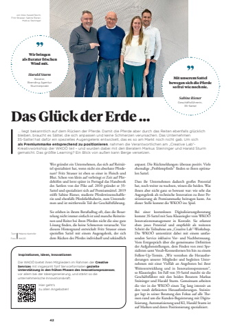 42 %u2026 liegt bekanntlich auf dem R%u00fccken der Pferde. Damit die Pferde aber durch das Reiten ebenfalls gl%u00fccklich bleiben, braucht es S%u00e4ttel, die sich anpassen und keine Schmerzen verursachen. Das Unternehmen 3S-Sattel hat daf%u00fcr ein spezielles Augengelenk entwickelt, das es so am Markt noch nicht gab. Um sich als Premiummarke entsprechend zu positionieren, nahmen die Verantwortlichen am %u201eCreative Lab%u201c-Kreativworkshop der WKO%u00d6 teil %u2013 und wurden dabei mit den Beratern Markus Steininger und Harald Sturm gematcht. Das gr%u00f6%u00dfte Learning? Ein Blick von au%u00dfen kann Berge versetzen.Wer gr%u00fcndet ein Unternehmen, das sich auf Reits%u00e4ttel spezialisiert hat, wenn nicht ein absoluter Pferdenarr? Fritz Strasser ist eben so einer in Fleisch und Blut. Schon von klein auf verbringt er Zeit auf Pferdeh%u00f6fen und lernt sp%u00e4ter in Portugal das Handwerk des Sattlers von der Pike auf. 2010 gr%u00fcndet er 3SSattel und spezialisiert sich auf Premiums%u00e4ttel. 2019 st%u00f6%u00dft Sabine Riener, studierte Pferdewissenschaftlerin und ebenfalls Pferdeliebhaberin, zum Unternehmen und ist mittlerweile Teil der Gesch%u00e4ftsf%u00fchrung.Sie erleben in ihrem Berufsalltag oft, dass die Besattelung nicht immer einfach ist und manche Reiterinnen und Reiter bei ihren Pferden nicht die eine gute L%u00f6sung ff nden, die keine Schmerzen verursacht. Vor diesem Hintergrund entwickelt Fritz Strasser einen speziellen Sattel mit einem Augengelenk, der sich dem R%u00fccken des Pferdes individuell und sek%u00fcndlich Das Gl%u00fcck der Erde %u2026anpasst. Die R%u00fcckmeldungen: %u00fcberaus positiv. Viele ehemalige %u201eProblempferde%u201c ff nden so ihren optimalen Sattel.Dass ihr Unternehmen dadurch gro%u00dfes Potential hat, noch weiter zu wachsen, wissen die beiden. Was ihnen aber nicht ganz so bewusst war: wie sehr das Augengelenk als technische Innovation zu ihrer Positionierung als Premiummarke beitragen kann. An dieser Stelle kommt die WKO%u00d6 ins Spiel.Bei einer kostenlosen Digitalisierungsberatung kommt 3S-Sattel mit Sara Klausriegler vom WKO%u00d6 Innovationsmanagement in Kontakt. Sie erkennt eben jenes Potential und empff ehlt als weiteren Schritt die Teilnahme am %u201eCreative Lab%u201c-Workshop. Die WKO%u00d6 unterst%u00fctzt dabei mit einem umfassenden Service inklusive Vor- und Nachbetreuung. Vom Erstgespr%u00e4ch %u00fcber die gemeinsame Deff nition der Aufgabenstellungen, dem Finden von zwei Spezialisten samt Vorab-Kennenlernen bis hin zu einem Follow-Up-Termin. %u201eWir verstehen die Herausforderungen unserer Mitglieder und begleiten Unternehmen mit einer Vielfalt an Angeboten bei ihrer Weiterentwicklung und in Innovationsprozessen%u201c, so Klausriegler. Im Fall von 3S-Sattel matcht sie die Gesch%u00e4ftsf%u00fchrer mit den beiden Beratern Markus Steininger und Harald Sturm. Gemeinsam arbeiten die vier in der WKO%u00d6 einen Tag lang intensiv an den vorab deff nierten Herausforderungen. Steininger legt in seiner Beratung den Fokus auf alle %u001a emen rund um die Kunden-Begeisterung mit Digitalisierung, Automatisierung und KI, Harald Sturm ist auf Marken und deren Positionierung spezialisiert. Text Melanie Kashofer Foto WKO%u00d6von links: Harald Sturm, Fritz Strasser, Sabine Riener, Markus SteiningerWir bringen als Berater frischen Wind mit.Harald SturmBerater, Branding Agentur SturmerprobtMit unserem Sattel bewegen sich die Pferde so frei wie noch nie.Sabine RienerGesch%u00e4ftsf%u00fchrerin, 3S-SattelInspirationen, Ideen, InnovationenDie WKO%u00d6 bietet ihren Mitgliedern im Rahmen der Creative Services mit insgesamt f%u00fcnf Serviceformaten gezielte Unterst%u00fctzung in den fr%u00fchen Phasen des Innovationsprozesses, vor allem bei der Ideengenerierung, und st%u00e4rkt so die unternehmerische Innovationskraft. Hier geht%u2019s zu allen Angeboten!