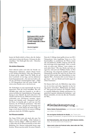 49kannst du Musik einfach so h%u00f6ren, aber die Ausbaustufe davon ist dann das Konzert. Da kannst du alles miterleben.%u201c Der Markt gibt ihm recht %u2013 Menschen wollen Video.Die n%u00e4chste DimensionDoch w%u00e4hrend andere noch %u00fcber die Vorteile von Videopodcasts diskutieren, arbeitet Martin bereits an der n%u00e4chsten Revolution. Oder eher Dimension. Er deutet auf die %u201eApple Vision Pro%u201c-Brille, die auf dem Couchtisch vor uns liegt, und das dahinterstehende Kamerakonstrukt. %u201eDas sind zwei GoPros, die ich mit 3D-Druck zusammengebaut habe%u201c, erkl%u00e4rt er. 3D-Videopodcasts sind sein neues Projekt. Mit einem seiner Kunden setzt er das bereits um. Die Technologie ist noch experimentell, das Set-up improvisiert, doch die Vision kristallklar: Wer eine VR-Brille tr%u00e4gt, erlebt das Gespr%u00e4ch so, als s%u00e4%u00dfe er mitten im Raum der Gespr%u00e4chspartner. Ein gewagter Sprung in eine Zukunft, die noch nicht da ist. Zumindest nicht hier bei uns. W%u00e4hrend in China bereits w%u00f6chentlich neue 3D-Podcasts entstehen, z%u00f6gern Europa und Amerika noch. %u201eEuropaweit sind wir die Ersten. In Amerika gibt es auch nur zwei Produzenten, die 3D-Podcasts produzieren.%u201c Man h%u00f6rt Martins Stolz heraus. %u201eIch gebe der Technologie drei bis f%u00fcnf Jahre%u201c, meint Martin auf unsere Frage, wie lange es noch dauern wird, bis wir unseren Lieblingspodcastern durch die 3D-Brillen zugucken. Der WissensvermittlerDer Name PUKA zieht sich durch alle seine Vorhaben. Und das nicht zuf%u00e4llig. %u201e%u201aPuka%u2018 bedeutet in Maori so viel wie %u201abilden%u2018%u201c, erkl%u00e4rt uns Martin. Und er selbst sieht sich als Wissensvermittler in einer ober-ffl%u00e4chlichen Zeit. Martins Leidenschaft brennt ungebrochen. Woran man das merkt? An seinen Tr%u00e4umen. Denn der 31-J%u00e4hrige tr%u00e4umt gr%u00f6%u00dfer als nur von (3D-)Videopodcasts. Seine langfristige Vision ist es, Dokumentarfflme zu produzieren, die Wissen vermitteln und Mehrwert schaffien. Podcasts sind f%u00fcr ihn aber noch lange nicht ausgesch%u00f6pft: %u201eNein, es macht nicht %u201aeh schon jeder Podcasts%u2018. Sonst w%u00fcrden wir auch jeden h%u00f6ren.%u201c Wer eine Nische und etwas zu sagen hat, wird auch sein Publikum ffnden, ist Martin %u00fcberzeugt. Sein Anspruch: Qualit%u00e4t statt Masse. Videopodcasts sind f%u00fcr ihn nicht nur ein Trend, sondern ein Schritt zur%u00fcck zum Menschlichen in einer digitalen Welt. %u201eDu kannst dich von der Stimme tragen lassen %u2013 aber erst Mimik und Gestik zeigen die echten Emotionen.%u201cDie Kamera l%u00e4uft noch, der Bildschirm zeigt weiter, wie wir da sitzen und reden. Irgendwie ist das Setting immer noch dieses %u201eWohnzimmer, das keines ist%u201c. Aber genau hier passiert%u2019s: die Zukunft, einfach so, zwischen Kaffieetassen, Kabeln und Kameras. Gespr%u00e4ch f%u00fcr Gespr%u00e4ch, Aufnahme f%u00fcr Aufnahme %u2013 und Martin mittendrin, als w%u00e4re das alles das Normalste der Welt._Du kannst dich von der Stimme tragen lassen %u2013 aber erst Mimik und Gestik zeigen die echten Emotionen.Martin EnglederGr%u00fcnder, PUKA#Gedankensprung ...Meine liebste Podcaststimme_zum Schneiden: Steffi Sperr; zum H%u00f6ren: Ali MahlodjiDie nervigsten Ger%u00e4usche im Studio_das Ticken einer analogen Armbanduhr, Zungenschnalzen bei der BearbeitungEin Podcastmythos, den ich aus der Welt r%u00e4umen m%u00f6chte_Dass %u201eeh schon jeder einen Podcast hat%u201c.Wenn mein Leben ein Podcast w%u00e4re, dann w%u00e4re der Titel_%u201eThe Ups and Downs%u201c