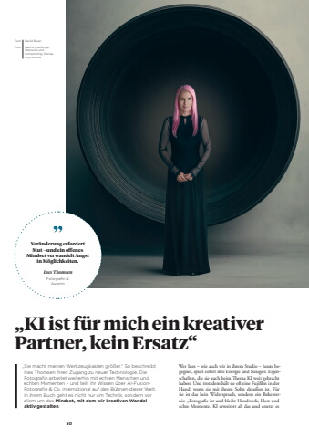 50Text David BauerFoto Sabine Kneidinger, Retusche und Compositing: Denisa Krycnerova%u201eKI ist f%u00fcr mich ein kreativer Partner, kein Ersatz%u201c%u201eSie macht meinen Werkzeugkasten gr%u00f6%u00dfer.%u201c So beschreibt Ines Thomsen ihren Zugang zu neuer Technologie. Die Fotografin arbeitet weiterhin mit echten Menschen und echten Momenten %u2013 und teilt ihr Wissen %u00fcber AI-FusionFotografie & Co. international auf den B%u00fchnen dieser Welt. In ihrem Buch geht es nicht nur um Technik, sondern vor allem um das Mindset, mit dem wir kreativen Wandel aktiv gestalten.Wer Ines %u2013 wie auch wir in ihrem Studio %u2013 heute begegnet, sp%u00fcrt sofort ihre Energie und Neugier. Eigenschaften, die sie auch beim %u001aema KI weit gebracht haben. Und trotzdem h%u00e4lt sie oft eine Fujifflm in der Hand, wenn sie mit ihrem Sohn drau%u00dfen ist. F%u00fcr sie ist das kein Widerspruch, sondern ein Bekenntnis: %u201eFotograffe ist und bleibt Handwerk, Herz und echte Momente. KI erweitert all das und ersetzt es Ver%u00e4nderung erfordert Mut %u2013 und ein offenes Mindset verwandelt Angst in M%u00f6glichkeiten.Ines ThomsenFotografin & Autorin