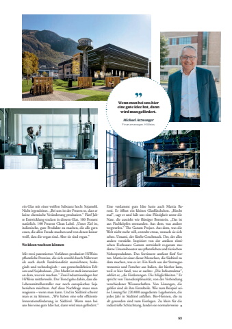 53ein Glas mit einer wei%u00dfen Substanz hoch: Sojamehl. Nicht irgendeines. %u201eBei uns ist der Prozess so, dass er keine chemische Ver%u00e4nderung produziert.%u201c F%u00fcnf Jahre Entwicklung stecken in diesem Glas. 100 Prozent nat%u00fcrlich. 100 Prozent Clean Label. %u201eUnser Ziel ist, italienische, gute Produkte zu machen, die alle gern essen, die allen Freude machen und von denen keiner wei%u00df, dass die vegan sind. Aber sie sind vegan.%u201cWo Ideen wachsen k%u00f6nnenMit zwei patentierten Verfahren produziert HiWeiss pfflanzliche Proteine, die sich sowohl durch N%u00e4hrwert als auch durch Funktionalit%u00e4t auszeichnen; biologisch und technologisch %u2013%u00a0aus gentechnikfreien Erbsen und Sojabohnen. %u201eDer Markt ist stark interessiert an dem, was wir machen.%u201c Zwei Industrieanlagen hat HiWeiss mittlerweile. Der Trend gehe dahin, dass die Lebensmittelhersteller nur noch europ%u00e4isches Soja beziehen m%u00f6chten. Auf diese Nachfrage muss man reagieren %u2013 wenn man kann. Und in S%u00fcdtirol scheint man es zu k%u00f6nnen. %u201eWir haben eine sehr eflziente Innovationsf%u00f6rderung in S%u00fcdtirol. Wenn man bei uns hier eine gute Idee hat, dann wird man gef%u00f6rdert.%u201cEine verdammt gute Idee hatte auch Mattia Baroni. Er %u00f6ffinet ein kleines Glasffl%u00e4schchen. %u201eRiecht mal%u201c, sagt er und h%u00e4lt uns eine Fl%u00fcssigkeit unter die Nase, die aussieht wie ffl%u00fcssiger Bernstein. %u201eDas ist aus Fischk%u00f6pfen entstanden. Aus dem, was andere wegwerfen.%u201c %u001ae Garum Project. Aus dem, was die Welt nicht mehr will, entsteht etwas, wonach sie sich sehnt. Umami, der f%u00fcnfte Geschmack. Der, der alles andere verst%u00e4rkt. Inspiriert von der antiken r%u00f6mischen Fischsauce Garum entwickelt re.garum moderne Umamibooster aus pfflanzlichen und tierischen Nebenprodukten. Das Sortiment umfasst f%u00fcnf Sorten. Mattia ist einer dieser Menschen, die S%u00fcdtirol zu dem machen, was es ist. Ein Koch aus der Sternegastronomie und Forscher aus Italien, der hierher kam, weil er hier fand, was er suchte: %u201eDie Infrastruktur%u201c, erkl%u00e4rt er, %u201edie F%u00f6rderungen. Die M%u00f6glichkeiten.%u201c Er spricht von Transdisziplinarit%u00e4t, von der Verbindung verschiedener Wissenschaften. Von L%u00f6sungen, die gr%u00f6%u00dfer sind als ihre Einzelteile. Wie zum Beispiel seine L%u00f6sung f%u00fcr 220.000 ausgediente Legehennen, die jedes Jahr in S%u00fcdtirol anfallen. Bio-Hennen, die zu alt geworden sind zum Eierlegen. Zu klein f%u00fcr die industrielle Schlachtung, landen sie normalerweise Wenn man bei uns hier eine gute Idee hat, dann wird man gef%u00f6rdert.Michael AtzwangerFinanzmanager, HiWeiss