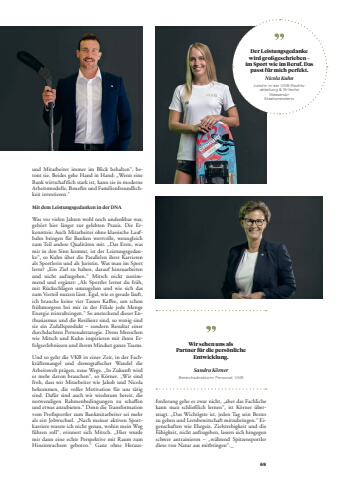 69und Mitarbeiter immer im Blick behalten%u201c, betont sie. Beides gehe Hand in Hand: %u201eWenn eine Bank wirtschaftlich stark ist, kann sie in moderne Arbeitsmodelle, Beneff ts und Familienfreundlichkeit investieren.%u201cMit dem Leistungsgedanken in der DNAWas vor vielen Jahren wohl noch undenkbar war, geh%u00f6rt hier l%u00e4ngst zur gelebten Praxis. Die Erkenntnis: Auch Mitarbeiter ohne klassische Laufbahn bringen f%u00fcr Banken wertvolle, wenngleich zum Teil andere Qualit%u00e4ten mit. %u201eDas Erste, was mir in den Sinn kommt, ist der Leistungsgedanke%u201c, so Kuhn %u00fcber die Parallelen ihrer Karrieren als Sportlerin und als Juristin. Was man im Sport lernt? %u201eEin Ziel zu haben, darauf hinzuarbeiten und nicht aufzugeben.%u201c Mitsch nickt zustimmend und erg%u00e4nzt: %u201eAls Sportler lernst du fr%u00fch, mit R%u00fcckschl%u00e4gen umzugehen und wie sich das zum Vorteil nutzen l%u00e4sst. Egal, wie es gerade l%u00e4uft, ich brauche keine vier Tassen Kaffi ee, um schon fr%u00fchmorgens bei mir in der Filiale jede Menge Energie reinzubringen.%u201c So ansteckend dieser Enthusiasmus und die Resilienz sind, so wenig sind sie ein Zufallsprodukt %u2013 sondern Resultat einer durchdachten Personalstrategie. Denn Menschen wie Mitsch und Kuhn inspirieren mit ihren Erfolgserlebnissen und ihrem Mindset ganze Teams. Und so geht die VKB in einer Zeit, in der Fachkr%u00e4ftemangel und demograff scher Wandel die Arbeitswelt pr%u00e4gen, neue Wege. %u201eIn Zukunft wird es mehr davon brauchen%u201c, so K%u00f6rner. %u201eWir sind froh, dass wir Mitarbeiter wie Jakob und Nicola bekommen, die voller Motivation f%u00fcr uns t%u00e4tig sind. Daf%u00fcr sind auch wir wiederum bereit, die notwendigen Rahmenbedingungen zu schaffi en und etwas anzubieten.%u201c Denn die Transformation vom Proff sportler zum Bankmitarbeiter sei mehr als ein Jobwechsel. %u201eNach meiner aktiven Sportkarriere wusste ich nicht genau, wohin mein Weg f%u00fchren soll%u201c, erinnert sich Mitsch. %u201eHier wurde mir dann eine echte Perspektive mit Raum zum Hineinwachsen geboten.%u201c Ganz ohne HerausDer Leistungsgedanke wird gro%u00dfgeschrieben %u2013 im Sport wie im Beruf. Das passt f%u00fcr mich perfekt.Nicola KuhnJuristin in der VKB-Rechtsabteilung & 16-fache WasserskiStaatsmeisterin%u00a0forderung gehe es zwar nicht, %u201eaber das Fachliche kann man schlie%u00dflich lernen%u201c, ist K%u00f6rner %u00fcberzeugt. %u201eDas Wichtigste ist, jeden Tag sein Bestes zu geben und Lernbereitschaft mitzubringen.%u201c Eigenschaften wie Ehrgeiz, Zielstrebigkeit und die F%u00e4higkeit, nicht aufzugeben, lassen sich hingegen schwer antrainieren %u2013 %u201ew%u00e4hrend Spitzensportler diese von Natur aus mitbringen%u201c._Wir sehen uns als Partner f%u00fcr die pers%u00f6nliche Entwicklung.Sandra K%u00f6rnerBereichsdirektorin Personal, VKB