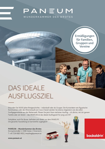 7Erm%u00e4%u00dfigungenf%u00fcr Familien,Gruppen undVereineErkunden Sie 9.000 Jahre Brotgeschichte %u2013 individuell oder als Gruppe. Die Kuriosit%u00e4ten wie %u00c4gyptische Kornmumien oder der %u00c4hrenstrau%u00df von Coco Chanel werden Sie ebenso begeistern wie die edlen Zunftgegenst%u00e4nde aus der B%u00e4ckerwelt. Planen Sie jetzt Ihren n%u00e4chsten Aus%u0086 ug %u2013 ob alleine, mit der ganzen Familie oder als Verein %u2013 das PANEUM ist das ideale Aus%u0086 ugsziel f%u00fcr Jung und Alt!Parkpl%u00e4tze, auch f%u00fcr Busse, be%u0092 nden sich direkt vor dem PANEUM.Die gesamte Ausstellung ist barrierefrei zug%u00e4nglich!PANEUM %u2013 Wunderkammer des BrotesKornspitzstra%u00dfe 1 / 4481 Asten / %u00d6sterreichT +43 7224 8821 400 / empfang@paneum.atwww.paneum.atParkpl%u00e4tze, auch f%u00fcr Busse, be%u0092 nden sich direkt vor dem PANEUM. %u2013 Wunderkammer des Brotes %u00d6sterreichKornmumien oder der %u00c4hrenstrau%u00df von Coco Chanel werden Sie ebenso begeistern wie die edlen Zunftgegenst%u00e4nde aus der B%u00e4ckerwelt. Planen Sie jetzt Ihren n%u00e4chsten Aus%u0086 ug %u2013 ob alleine, mit der ganzen Familie oder als Verein %u2013 das PANEUM ist das ideale Aus%u0086 ugsziel f%u00fcr Jung und Alt!DAS IDEALE AUSFLUGSZIEL