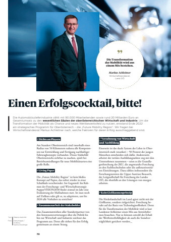 70 # Dichte an Playern Am Standort Ober%u00f6sterreich sind innerhalb eines Radius von 50 Kilometern nahezu alle Kompetenzen zur Entwicklung und Fertigung nachhaltiger Fahrzeugkonzepte vorhanden. Dieses St%u00e4rkefeld Ober%u00f6sterreichs sichtbar zu machen, spielt bei Betriebsansiedlungen f%u00fcr neue Mobilit%u00e4tsarten eine gro%u00dfe Rolle. # Living Paper Die %u201eFuture Mobility Region%u201c ist kein blo%u00dfes Konzept auf Papier, das sofort wieder in einer Schublade verschwindet. Im Gegenteil: Im Rahmen der Forschungs- und Wirtschaftsstrategie #upperVISION2030 ffndet einmal im Jahr eine Evaluierung der Ma%u00dfnahmen statt. Ist man noch auf Zielkurs oder gilt es, zu adaptieren, um bis 2030 alle Vorhaben zu erreichen? # Zusammenarbeit der Stakeholder Das Zusammenwirken aller Standortpartner von den Interessensvertretungen %u00fcber die Politik bis hin zur Wirtschaft und Industrie zeichnet das Programm aus. Denn alle ziehen f%u00fcr den Erfolg gemeinsam an einem Strang.Die Automobilzulieferindustrie z%u00e4hlt mit 90.000 Mitarbeitenden sowie rund 20 Milliarden Euro anGesamtumsatz zu den wesentlichen S%u00e4ulen der ober%u00f6sterreichischen Wirtschaft und Industrie. Um die Transformation der Mobilit%u00e4t als Chance und neues Wettbewerbsfeld zu nutzen, entstand Ende 2022ein strategisches Programm f%u00fcr Ober%u00f6sterreich %u2013 die %u201eFuture Mobility Region%u201c. Wir fragen bei Wirtschaftslandesrat Markus Achleitner nach, welche Faktoren f%u00fcr deren Erfolg ausschlaggebend sind.# Verzahnung von Wirtschaft und Ausbildung Einerseits ist das duale System der Lehre in Ober%u00f6sterreich stark verankert %u2013 50 Prozent der jungen Menschen entscheiden sich daf%u00fcr. Andererseits arbeitet der terti%u00e4re Ausbildungssektor eng mit den Unternehmen zusammen %u2013 seien es die Grundlagenforschung der JKU, die angewandte Forschung an den Fachhochschulen oder die au%u00dferuniversit%u00e4ren Einrichtungen. Dazu z%u00e4hlen insbesondere die Forschungszentren der Upper Austrian Research, der Leitgesellschaft f%u00fcr Forschung des Landes O%u00d6, die ebenfalls an den L%u00f6sungen von morgen arbeiten. # Kein Gie%u00dfkannenprinzip Die F%u00f6rderlandschaft im Land agiert nicht mit der Gie%u00dfkanne, sondern zielgerichtet. Forschung beruht auf der Basis von Technologieoffienheit. Denn f%u00fcr die Transformation der Mobilit%u00e4t wird es laut Landesrat Achleitner einen Mix aus Antriebsformen brauchen. Nur so k%u00f6nnen sowohl der Erhalt der Wettbewerbsf%u00e4higkeit als auch die Sozialvertr%u00e4glichkeit gesichert werden._Text Melanie KashoferFoto Gettyimages / hxdbzxy; Sabine KneidingerEinen Erfolgscocktail, bitte!Die Transformation der Mobilit%u00e4t wird aus einem Mix bestehen.Markus AchleitnerWirtschaftslandesrat, Land O%u00d6
