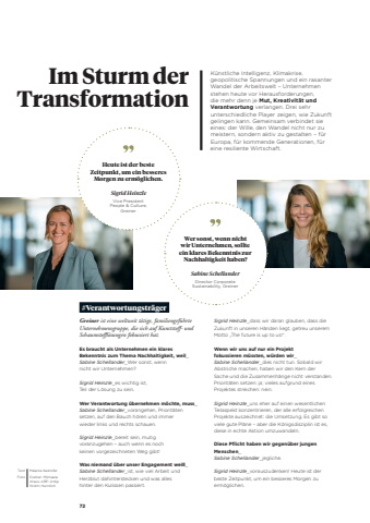 72Im Sturm der TransformationWer sonst, wenn nicht wir Unternehmen, sollte ein klares Bekenntnis zur Nachhaltigkeit haben?Sabine SchellanderDirector Corporate Sustainability, GreinerHeute ist der beste Zeitpunkt, um ein besseres Morgen zu erm%u00f6glichen.Sigrid HeinzleVice President People & Culture, GreinerK%u00fcnstliche Intelligenz, Klimakrise, geopolitische Spannungen und ein rasanter Wandel der Arbeitswelt %u2013 Unternehmen stehen heute vor Herausforderungen, die mehr denn je Mut, Kreativit%u00e4t und Verantwortung verlangen. Drei sehr unterschiedliche Player zeigen, wie Zukunft gelingen kann. Gemeinsam verbindet sie eines: der Wille, den Wandel nicht nur zu meistern, sondern aktiv zu gestalten %u2013 f%u00fcr Europa, f%u00fcr kommende Generationen, f%u00fcr eine resiliente Wirtschaft.Greiner ist eine weltweit t%u00e4tige, familiengef%u00fchrte Unternehmensgruppe, die sich auf Kunststoff- und Schaumstoffl%u00f6sungen fokussiert hat. Es braucht als Unternehmen ein klares Bekenntnis zum Thema Nachhaltigkeit, weil_Sabine Schellander_Wer sonst, wenn nicht wir Unternehmen?Sigrid Heinzle_es wichtig ist, Teil der L%u00f6sung zu sein.Wer Verantwortung %u00fcbernehmen m%u00f6chte, muss_Sabine Schellander_vorangehen, Priorit%u00e4ten setzen, auf den Bauch h%u00f6ren und immer wieder links und rechts schauen. Sigrid Heinzle_bereit sein, mutig voranzugehen %u2013 auch wenn es noch keinen vorgezeichneten Weg gibt!Was niemand %u00fcber unser Engagement wei%u00df_Sabine Schellander_ist, wie viel Arbeit und Herzblut dahinterstecken und was alles hinter den Kulissen passiert. #Verantwortungstr%u00e4ger Sigrid Heinzle_dass wir daran glauben, dass die Zukunft in unseren H%u00e4nden liegt, getreu unserem Motto %u201eThe future is up to us!%u201c.Wenn wir uns auf nur ein Projekt fokussieren m%u00fcssten, w%u00fcrden wir_Sabine Schellander_dies nicht tun. Sobald wir Abstriche machen, haben wir den Kern der Sache und die Zusammenh%u00e4nge nicht verstanden. Priorit%u00e4ten setzen: ja; vieles aufgrund eines Projektes streichen: nein. Sigrid Heinzle_uns eher auf einen wesentlichen Teilaspekt konzentrieren, der alle erfolgreichen Projekte auszeichnet: die Umsetzung. Es gibt so viele gute Pl%u00e4ne %u2013 aber die K%u00f6nigsdisziplin ist es, diese in echte Aktion umzuwandeln. Diese Pflicht haben wir gegen%u00fcber jungen Menschen_Sabine Schellander_jegliche. Sigrid Heinzle_vorauszudenken! Heute ist der beste Zeitpunkt, um ein besseres Morgen zu erm%u00f6glichen. Text Melanie KashoferFoto Greiner: Michaela Kraus; ABP: Antje Wolm; Hennlich