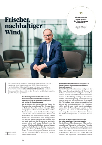 74Im Juli wurde er angelobt, der neue ober%u00f6sterreichische Landesrat und Vorsitzende der SP%u00d6 Ober%u00f6sterreich: Martin Winkler. H%u00f6chste Zeit also, mit dem ehemaligen Unternehmer %u00fcber seine Visionen f%u00fcr das Land und die Schwerpunkte, die er sich in der Energie- und Industriepolitik gesetzt hat, zu sprechen. Als ehemaliger Unternehmer: Was ist im Moment die gr%u00f6%u00dfte Herausforderung f%u00fcr ober%u00f6sterreichische Industriebetriebe und wie wollen sie dieser begegnen?Martin Winkler: F%u00fcr mich steht das %u001a ema der Energiepreise ganz oben auf der Agenda: Unsere Industrie braucht leistbare Energie. Hohe Energiepreise haben massiven Einffl uss auf Produktionskosten und Standortentscheidungen. Deshalb setze ich auf einen raschen Ausbau von Kraftwerken mit erneuerbarer Energie, konkret Windkraft-, Photovoltaik- und Pumpspeicherkraftwerken. Dieser dringend notwendige Ausbau senkt nicht nur die Stromkosten langfristig, sondern st%u00e4rkt auch unsere Industrie und die gesamte Wettbewerbsf%u00e4higkeit unseres Bundeslands. Ich habe bereits im Juli bei meiner Angelobung betont: %u201eMehr Energie f%u00fcr Ober%u00f6sterreich!%u201c %u2013 hei%u00dft: Energiepreise senken, Standort sichern. Dazu braucht es aber einen Schulterschluss aller Parteien. Text Melanie Kashofer Foto Robert MaybachWelche Rolle spielt K%u00fcnstliche Intelligenz in Ihrem Konzept f%u00fcr einen zukunftsf%u00e4higen Industriestandort?Martin Winkler: Ober%u00f6sterreich verf%u00fcgt an der JKU Linz %u00fcber ein gro%u00dfartiges KI-Institut mit Professor Hochreiter an der Spitze. Diese Ressourcen m%u00fcssen wir in Ober%u00f6sterreich maximal nutzen. KI durchdringt k%u00fcnftig die Produktion, hilft bei Efl zienzsteigerung, Prozessoptimierung und auch bei der Vorausschau der Wartungen. Die Verbindung von Industrieproduktion und KI sehe ich als Zukunftschance f%u00fcr Ober%u00f6sterreich, weil sie uns global wettbewerbsf%u00e4higer macht. F%u00fcr KI-Anwendungen braucht es allerdings sehr viel Strom und daf%u00fcr ben%u00f6tigen wir unbedingt den von mir bef%u00fcrworteten Ausbau der Kraftwerkskapazit%u00e4ten in unserem Bundesland.Wie sieht f%u00fcr Sie ein Ober%u00f6sterreich aus, das auf erneuerbarer Energie gebaut ist?Martin Winkler: Mit einem guten Mix aus leistungsf%u00e4higen Windparks, gro%u00dfen Agri-PV-Anlagen und neuen Pumpspeicherkraftwerken sowie dem Ausbau der letzten Flusswasserkraftreserven stellen wir sicher, dass Ober%u00f6sterreich Industriebundesland Nummer eins bleibt. Dadurch schaffi en wir regionales Wirtschaftswachstum Wir m%u00fcssen alle Menschen bei der Energiewende mitnehmen.Martin WinklerO%u00f6 LandesratFrischer, nachhaltiger Wind