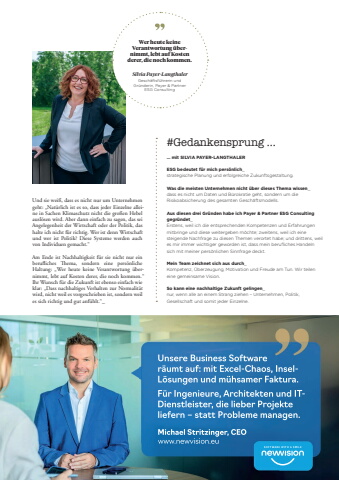77#Gedankensprung ...%u2026 mit SILVIA PAYER-LANGTHALERESG bedeutet f%u00fcr mich pers%u00f6nlich_strategische Planung und erfolgreiche Zukunftsgestaltung.Was die meisten Unternehmen nicht %u00fcber dieses Thema wissen_dass es nicht um Daten und B%u00fcrokratie geht, sondern um die Risikoabsicherung des gesamten Gesch%u00e4ftsmodells.Aus diesen drei Gr%u00fcnden habe ich Payer & Partner ESG Consulting gegr%u00fcndet_Erstens, weil ich die entsprechenden Kompetenzen und Erfahrungen mitbringe und diese weitergeben m%u00f6chte; zweitens, weil ich eine steigende Nachfrage zu diesen Themen verortet habe; und drittens, weil es mir immer wichtiger geworden ist, dass mein berufliches Handeln sich mit meiner pers%u00f6nlichen Sinnfrage deckt.Mein Team zeichnet sich aus durch_Kompetenz, %u00dcberzeugung, Motivation und Freude am Tun. Wir teilen eine gemeinsame Vision.So kann eine nachhaltige Zukunft gelingen_nur, wenn alle an einem Strang ziehen %u2013 Unternehmen, Politik, Gesellschaft und somit jeder Einzelne.Und sie wei%u00df, dass es nicht nur um Unternehmen geht: %u201eNat%u00fcrlich ist es so, dass jeder Einzelne alleine in Sachen Klimaschutz nicht die gro%u00dfen Hebel ausl%u00f6sen wird. Aber dann einfach zu sagen, das sei Angelegenheit der Wirtschaft oder der Politik, das halte ich nicht f%u00fcr richtig. Wer ist denn Wirtschaft und wer ist Politik? Diese Systeme werden auch von Individuen gemacht.%u201cAm Ende ist Nachhaltigkeit f%u00fcr sie nicht nur ein beruffl iches %u001a ema, sondern eine pers%u00f6nliche Haltung: %u201eWer heute keine Verantwortung %u00fcbernimmt, lebt auf Kosten derer, die noch kommen.%u201c Ihr Wunsch f%u00fcr die Zukunft ist ebenso einfach wie klar: %u201eDass nachhaltiges Verhalten zur Normalit%u00e4t wird, nicht weil es vorgeschrieben ist, sondern weil es sich richtig und gut anf%u00fchlt.%u201c_Wer heute keine Verantwortung %u00fcbernimmt, lebt auf Kosten derer, die noch kommen.Silvia Payer-LangthalerGesch%u00e4ftsf%u00fchrerin und Gr%u00fcnderin, Payer & Partner ESG Consulting