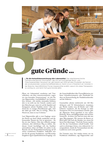 78gute Gr%u00fcnde %u2026%u2026 f%u00fcr die Herkunftskennzeichnung aller Lebensmittel. Das ober%u00f6sterreichische Familienunternehmen Gourmetfein, das sich auf hochwertige Wurst- und Fleischspezialit%u00e4ten fokussiert hat, gibt bereits seit 2016 bei allen Produkten die Namen der produzierenden Landwirtschaftsbetriebe an. Damit ist es in %u00d6sterreich ein Vorreiter in der Branche. Gesch%u00e4ftsf%u00fchrer Florian Hippesroither erz%u00e4hlt, warum ihm diese Transparenz so wichtig ist, und nennt f%u00fcnf gute Gr%u00fcnde daf%u00fcr.%u201eWenn wir Lebensmittel verarbeiten und Tiere schlachten, um diese weiterzuverarbeiten, tragen wir eine besondere Verantwortung%u201c, ist sich Florian Hippesroither, Gesch%u00e4ftsf%u00fchrer von Gourmetfein, bewusst. %u201eIch m%u00f6chte niemanden belehren, aber es tut nicht nur der Umwelt, sondern auch den Menschen gut, wenn wir auf die Qualit%u00e4t und Transparenz unserer Produkte setzen.%u201c Dass der Trend hin zu weniger Fleischkonsum geht, st%u00f6rt ihn dabei gar nicht. Ihm ist wichtig: %u201eWenn du Fleisch isst, dann iss was G%u2019scheites.%u201cLaut Hippesroither gibt es zwei Zug%u00e4nge: entweder Fleisch am freien Markt zuzukaufen und die brennenden %u001aemen der Zeit zu ignorieren %u2013 f%u00fcr ihn nie eine Option. Oder den vielleicht unangenehmeren, aber ehrlicheren Weg zu w%u00e4hlen. Aus diesem Grund besch%u00e4ftigte sich das Familienunternehmen schon viel fr%u00fcher als andere in der Branche mit der Herkunftskennzeichnung auf all seinen verarbeiteten Produkten. Au%u00dferdem wurden f%u00fcr die gesamte Produktions- und Wertsch%u00f6pfungskette eigene Qualit%u00e4tskriterien festgelegt, von der Gentechnikfreiheit %u00fcber Tierwohlkriterien wie kurze Lebendtiertransporte oder Platzbedarf bis eben zur Kennzeichnung der Produktionsbetriebe auf den Etiketten. Gourmetfein arbeitet mittlerweile mit 160 Rinderbauern und 50 Schweinebauern zusammen, pro Woche werden circa 60 Rinder und 1.500 Schweine verarbeitet. Als die Strategie zu mehr Transparenz 2014 im Unternehmen entsteht, geht der allgemeine Trend eigentlich in eine andere Richtung. Masse und Billigprodukte sind auf dem Vormarsch. %u201eIn dieser Zeit sind wir einen sehr mutigen Weg gegangen. Wir mussten die Bauern an Bord holen und auch die Kunden von einem h%u00f6heren Preis %u00fcberzeugen.%u201c Doch der Prozess machte sich f%u00fcr das Unternehmen schnell bezahlt. Und auch in schwierigen Zeiten, etwa w%u00e4hrend der Coronapandemie, wurde die Vertrauensbasis mit den Landwirten noch weiter gest%u00e4rkt.Die Vision%u00e4re einer Zeit w%u00fcrden immer erst im Nachhinein rehabilitiert, sagt Hippesroither und Text Melanie KashoferFoto Gourmetfein