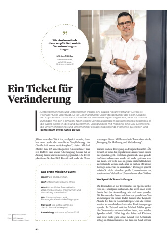82%u201eUnternehmerinnen und Unternehmer tragen eine soziale Verantwortung!%u201c Davon ist Michael M%u00fcller %u00fcberzeugt. Er ist Gesch%u00e4ftsf%u00fchrer und Miteigent%u00fcmer der soloX Gruppe. Im Zuge dessen war er oft auf karitativen Veranstaltungen eingeladen, aber nie wirklich zufrieden mit den Formaten. Nach einem Schicksalsschlag im Bekanntenkreis beschloss er, die Sache selbst in die Hand zu nehmen, und gr%u00fcndete mit missionX eine B2B-Eventreihe, die Unternehmerinnen und Unternehmer einl%u00e4dt, inspirierende Momente zu erleben und gemeinsam etwas Gutes zu tun.%u201eWenn man das Gl%u00fcck hat, erfolgreich zu sein, dann hat man auch die moralische Verpfflichtung, der Gesellschaft etwas zur%u00fcckzugeben%u201c, zitiert Michael M%u00fcller den US-amerikanischen Unternehmer Warren Buffiett. Aus dieser %u00dcberzeugung heraus hat er Anfang dieses Jahres missionX gegr%u00fcndet. Die Eventplattform f%u00fcr den B2B-Bereich soll mehr als VeranText Melanie KashoferFoto Cliff Kapatais, Gettyimages / Hraunstaltungen bieten. M%u00fcller und sein Team sehen sie als %u201eBewegung f%u00fcr Hoffinung und Ver%u00e4nderung%u201c.Warum es diese Bewegung so dringend braucht? %u201e%u00d6sterreich ist eines der popul%u00e4rsten L%u00e4nder, wenn es um das Spenden geht. Trotzdem glaube ich, dass gerade im Unternehmertum noch viel mehr geleistet werden kann. Ich wei%u00df, dass es gerade wirtschaftlich herausfordernde Zeiten sind, aber es reichen oft kleine Beitr%u00e4ge, um etwas zu ver%u00e4ndern.%u201c Deswegen spricht missionX nicht einzelne gro%u00dfe Unternehmen an, sondern eine Vielzahl an Unternehmen aller Gr%u00f6%u00dfen.Von Sport bis TeamchallengesDas Besondere an der Eventreihe: Die Spende ist bereits im Ticketpreis inkludiert, das hei%u00dft, man wei%u00df bereits bei der Anmeldung, wie viel man spendet. Die Formate der Events reichen von sportlichen Veranstaltungen wie einem Padel-Turnier %u00fcber KeynoteAbende bis hin zu Teamchallenges. Und die Erl%u00f6se werden an verschiedene karitative Einrichtungen gespendet. In Zukunft m%u00f6chte Michael M%u00fcller gerne die Community mitentscheiden lassen, wer welche Spenden erh%u00e4lt. 2026 liegt der Fokus auf Kindern, und zwar nicht ganz ohne Grund. Ein Schicksalsschlag im Bekanntenkreis, bei dem ein Kind schwer Das erste missionX-EventWann? 23. Oktober 2025Wo? Ottakringer Brauerei, WienWas? Kick-off der Eventreihe f%u00fcr 2026 mit Livemusik, Pokerturnier und Vorstellung von missionXWer? Unternehmen und F%u00fchrungskr%u00e4fte sind die Zielgruppe.F%u00fcr wen? Die Erl%u00f6se gehen an das St. Anna Kinderspital.Anmeldung: missionx.at/kick-off-26Ein Ticket f%u00fcr Ver%u00e4nderungWir sind moralisch dazu verpflichtet, soziale Verantwortung zu tragen.Michael M%u00fcllerGesch%u00e4ftsf%u00fchrer, soloX Gruppe; Gr%u00fcnder, missionX