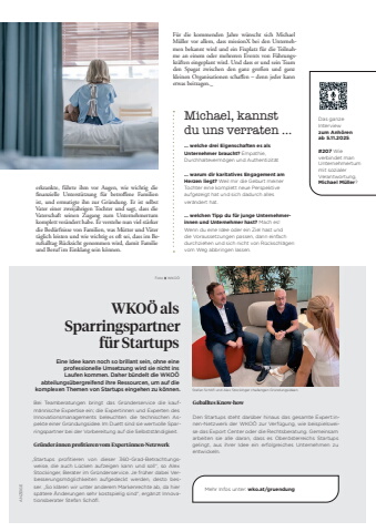 83Michael, kannst du uns verraten %u2026%u2026 welche drei Eigenschaften es als Unternehmer braucht? Empathie, Durchhalteverm%u00f6gen und Authentizit%u00e4t%u2026 warum dir karitatives Engagement am Herzen liegt? Weil mir die Geburt meiner Tochter eine komplett neue Perspektive aufgezeigt hat und sich dadurch alles ver%u00e4ndert hat. %u2026 welchen Tipp du f%u00fcr junge Unternehmerinnen und Unternehmer hast? Mach es! Wenn du eine Idee oder ein Ziel hast und die Voraussetzungen passen, dann einfach durchziehen und sich nicht von R%u00fcckschl%u00e4gen vom Weg abbringen lassen. erkrankte, f%u00fchrte ihm vor Augen, wie wichtig die ff nanzielle Unterst%u00fctzung f%u00fcr betroffi ene Familien ist, und ermutigte ihn zur Gr%u00fcndung. Er ist selbst Vater einer zweij%u00e4hrigen Tochter und sagt, dass die Vaterschaft seinen Zugang zum Unternehmertum komplett ver%u00e4ndert habe. Er verstehe nun viel st%u00e4rker die Bed%u00fcrfnisse von Familien, was M%u00fctter und V%u00e4ter t%u00e4glich leisten und wie wichtig es oft sei, dass im Berufsalltag R%u00fccksicht genommen wird, damit Familie und Beruf im Einklang sein k%u00f6nnen.Das ganze Interview zum Anh%u00f6ren ab 5.11.2025. #207 Wie verbindet man Unternehmertum mit sozialer Verantwortung, Michael M%u00fcller?F%u00fcr die kommenden Jahre w%u00fcnscht sich Michael M%u00fcller vor allem, dass missionX bei den Unternehmen bekannt wird und ein Fixplatz f%u00fcr die Teilnahme an einem oder mehreren Events von F%u00fchrungskr%u00e4ften eingeplant wird. Und dass er und sein Team den Spagat zwischen den ganz gro%u00dfen und ganz kleinen Organisationen schaffi en %u2013 denn jeder kann etwas beitragen._ANZEIGEEine Idee kann noch so brillant sein, ohne eine professionelle Umsetzung wird sie nicht ins Laufen kommen. Daher b%u00fcndelt die WKO%u00d6 abteilungs%u00fcbergreifend ihre Ressourcen, um auf die komplexen Themen von Startups eingehen zu k%u00f6nnen.WKO%u00d6 als Sparringspartner f%u00fcr StartupsBei Teamberatungen bringt das Gr%u00fcnderservice die kaufm%u00e4nnische Expertise ein; die Expertinnen und Experten des Innovationsmanagements beleuchten die technischen Aspekte einer Gr%u00fcndungsidee. Im Duett sind sie wertvolle Sparringspartner bei der Vorbereitung auf die Selbstst%u00e4ndigkeit.Gr%u00fcnder:innen profi tieren vom Expert:innen-Netzwerk%u201eStartups profitieren von dieser 360-Grad-Betrachtungsweise, die auch L%u00fccken aufzeigen kann und soll%u201c, so Alex Stockinger, Berater im Gr%u00fcnderservice. Je fr%u00fcher dabei Verbesserungsm%u00f6glichkeiten aufgedeckt werden, desto besser. %u201eSo kl%u00e4ren wir unter anderem Markenrechte ab, da hier sp%u00e4tere %u00c4nderungen sehr kostspielig sind%u201c, erg%u00e4nzt Innovationsberater Stefan Sch%u00f6fl.Geballtes Know-howDen Startups steht dar%u00fcber hinaus das gesamte Expert:innen-Netzwerk der WKO%u00d6 zur Verf%u00fcgung, wie beispielsweise das Export Center oder die Rechtsberatung. Gemeinsam arbeiten sie alle daran, dass es Ober%u00f6sterreichs Startups gelingt, aus ihrer Idee ein erfolgreiches Unternehmen zu entwickeln.Mehr Infos unter: wko.at/gruendung Foto WKO%u00d6Stefan%u0009Sch%u00f6fl%u0009%u0009und%u0009Alex%u0009Stockinger%u0009challengen%u0009Gr%u00fcndungsideen.