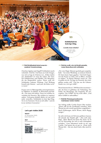 86Sichtbarkeit ist kein Ego-Ding.Carolin Anne SchiebelGr%u00fcnderin des %u201eLet%u2018s get visible%u201c-Festivals #6 | Weil sie wei%u00df, wie viel Kraft entsteht, wenn Menschen sich verbinden%u201eDer erste Magic Moment geschah ganz unspektakul%u00e4r %u2013 bei einem Workshop, an meinem Esstisch. Ich hatte kaum Input gegeben. Und doch begannen die Frauen zu reden, sich zu %u00f6ffi nen, einander zu st%u00e4rken.%u201c In diesem Moment wusste sie: %u201eDas ist gr%u00f6%u00dfer als ich. Da liegt ein Potential, das wachgek%u00fcsst werden will.%u201c Und das war die Geburtsstunde von %u201eLet%u2019s get visible%u201c.Heute kommen bis zu 1.500 Menschen zusammen %u2013 aber der Kern ist geblieben: die Verbindung. Der Funke, der %u00fcberspringt. Die Gespr%u00e4che, die weitergehen. Das Gef%u00fchl: Ich bin nicht allein. %u201eUnd dieses Gef%u00fchl ist unbezahlbar.%u201c #7 | Weil ihr Warum gewachsen ist. Und immer weiter w%u00e4chst Am Anfang wollte Carolin Frauen Mut machen. %u201eHeute will ich die Gesellschaft ver%u00e4ndern. Mein Warum hat sich vertieft, geschichtet, ausgef%u00e4chert %u2013 durch Erfahrungen, durch Wissen, durch Begegnungen.%u201c Sie sieht sich heute als Teil eines gr%u00f6%u00dferen Ganzen. Als jemand, der Impulse gibt %u2013 aber auch empf%u00e4ngt. %u201eMein Warum hat keine ff xe Form. Es ist wie ein Herzschlag, der sich je nach Lebensphase ver%u00e4ndert.%u201c Ganz ankommen werde sie nie, sagt Carolin. Und genau das sei gut so. %u201eDenn mein Warum lebt %u2013 mit mir, durch mich, %u00fcber mich hinaus.%u201c_ #5 | Weil Sichtbarkeit kein Luxus ist %u2013 sondern VerantwortungZwischen Applaus und Angriffi : Sichtbarkeit macht verletzlich. Und frei. Und kann ans Licht bringen, was viel zu lang im Schatten war. %u201eFr%u00fcher dachte ich, Sichtbarkeit sei etwas f%u00fcr andere. F%u00fcr Stars. F%u00fcr Politikerinnen und Politiker. F%u00fcr Menschen, die das Rampenlicht suchen. Heute wei%u00df ich: Sichtbarkeit bedeutet Wirkung. Und Wirkung braucht jede Stimme %u2013 auch jene, die bisher zu leise waren.%u201c Frauen seien in F%u00fchrungsrollen unterrepr%u00e4sentiert. In Talkshows. In Medien. In Wirtschaft und Politik. %u201eDas muss sich %u00e4ndern. Denn wer sichtbar ist, ver%u00e4ndert die Narrative. Wer sichtbar ist, inspiriert andere. Und genau deshalb d%u00fcrfen wir uns nicht mehr verstecken. Sichtbarkeit ist kein Ego-Ding. Sie ist ein Statement. Ein Ja zu sich selbst %u2013 und ein Ja zur n%u00e4chsten Generation.%u201cLet%u2019s get visible 2025Wann?21. November 2025, 8.50%u201319.00 UhrWo?Brucknerhaus LinzTickets!Mit dem Code diemacher10 erh%u00e4ltst du 10 %u00a4 Rabatt auf die Tickets.