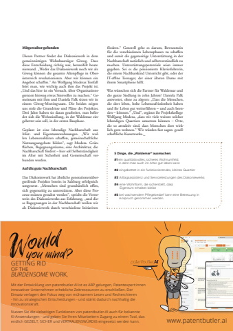 99Mitgestalter gefunden Diesen Partner ff ndet das Diakoniewerk in dem gemeinn%u00fctzigen Wohnbautr%u00e4ger Giwog. Dass diese Entscheidung richtig war, bezweifelt heute niemand. %u201eWeder das Diakoniewerk noch wir als Giwog k%u00f6nnen die gesamte Altenpffl ege in Ober%u00f6sterreich revolutionieren. Aber wir k%u00f6nnen ein Angebot schaffi en.%u201c An Wolfgang Moderas Tonfall h%u00f6rt man, wie wichtig auch ihm das Projekt ist. %u201eUnd das hier ist ein Versuch, %u00fcber Organisationsgrenzen hinweg etwas Sinnvolles zu machen.%u201c Gemeinsam mit ihm und Daniela Palk sitzen wir in einem Giwog-Meetingraum. Die beiden zeigen uns stolz die Grundrisse und Pl%u00e4ne des Projektes. Drei Jahre haben sie daran gearbeitet, nun beff ndet sich die Wohnsiedlung, in der Waldemar eingebettet sein soll, in der ersten Bauphase. Geplant ist eine lebendige Nachbarschaft aus Miet- und Eigentumswohnungen. %u201eWir wollen Lebensrealit%u00e4ten schaffi en, gemeinschaftliche Nutzungsangebote bilden%u201c, sagt Modera. Gr%u00fcn-ffl %u00e4chen, Begegnungsr%u00e4ume, eine Architektur, die Nachbarschaft f%u00f6rdert %u2013 hier soll Selbstst%u00e4ndigkeit im Alter mit Sicherheit und Gemeinschaft verbunden werden.Auf die gute Nachbarschaft Das Diakoniewerk hat %u00e4hnliche generationen%u00fcbergreifende Projekte bereits in Salzburg erfolgreich umgesetzt. %u201eMenschen sind grunds%u00e4tzlich offi en, sich gegenseitig zu unterst%u00fctzen. Aber diese Prozesse m%u00fcssen gestaltet werden%u201c, spricht die Vertreterin des Diakoniewerks aus Erfahrung, %u201eund diese Begegnungen in der Nachbarschaft wollen wir als Diakoniewerk durch verschiedene Initiativen f%u00f6rdern.%u201c Generell gehe es darum, Bewusstsein f%u00fcr die verschiedenen Lebensphasen zu schaffi en und somit die gegenseitige Unterst%u00fctzung in der Nachbarschaft nat%u00fcrlich und selbstverst%u00e4ndlich zu machen. Unterst%u00fctzungspotentiale seien immer gegeben. Sei es die pensionierte Klavierlehrerin, die einem Nachbarskind Unterricht gibt, oder der IT-afl ne Teenager, der einer %u00e4lteren Dame mit ihrem Smartphone hilft.Was w%u00fcnschen sich die Partner f%u00fcr Waldemar und die ganze Siedlung in zehn Jahren? Daniela Palk antwortet, ohne zu z%u00f6gern: %u201eDass die Menschen, die dort leben, hohe Lebenszufriedenheit haben und ihr Leben gut weiterf%u00fchren %u2013 und auch beenden %u2013 k%u00f6nnen.%u201c %u201eUnd%u201c, erg%u00e4nzt ihr Projektkollege Wolfgang Modera, %u201edass wir viele weitere solcher lebendigen Quartiere umsetzen k%u00f6nnen %u2013 Orte, die so attraktiv sind, dass Menschen dort wirklich gern wohnen.%u201c Wir w%u00fcrden fast sagen: gesellschaftliche Kunstwerke._5 Dinge, die %u201eWaldemar%u201c ausmachen: #1 ein qualit%u00e4tsvolles, sicheres Wohnumfeld, in dem man auch im Alter gut leben kann#2 eingebettet in ein funktionierendes, kleines Quartier#3 Alltagsassistenz und Serviceleistungen des Diakoniewerks#4 eine Wohnform, die sicherstellt, dass Eigentum erhalten bleibt#5 bei wachsendem Pflegebedarf kann eine Betreuung in Anspruch genommen werden.www.patentbutler.aiGETTING RID OF THEBURDENSOME WORK.Mit der Entwicklung von patentbutler.AI ist es ABP gelungen, Patentexpert:innen innovativer Unternehmen erhebliche Zeitressourcen zu erschlie%u00dfen. Der Einsatz verlagert den Fokus weg von m%u00fchsamem Lesen und Recherchieren - hin zu strategischen Entscheidungen - und st%u00e4rkt dadurch nachhaltig die Innovationskraft.Nutzen Sie die vielseitigen Funktionen von patentbutler.AI auch f%u00fcr bekannteKI-Anwendungen - und geben Sie Ihren Mitarbeitern Zugang zu einem Tool, das endlich GEZIELT, SICHER und VERTRAUENSW%u00dcRDIG eingesetzt werden kann.
