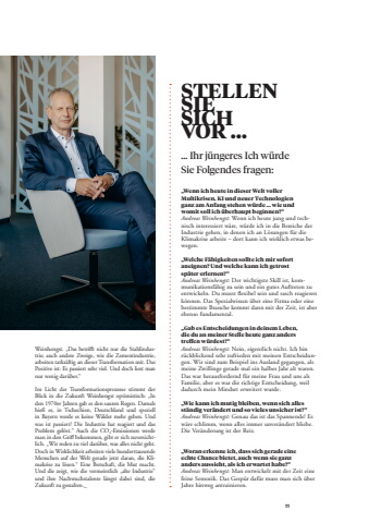 11STELLEN SIE SICH VOR %u2026%u2026 Ihr j%u00fcngeres Ich w%u00fcrde Sie Folgendes fragen:%u201eWenn ich heute in dieser Welt voller Multikrisen, KI und neuer Technologien ganz am Anfang stehen w%u00fcrde %u2026 wie und womit soll ich %u00fcberhaupt beginnen?%u201cAndreas Weinhengst: Wenn ich heute jung und technisch interessiert w%u00e4re, w%u00fcrde ich in die Bereiche der Industrie gehen, in denen ich an L%u00f6sungen f%u00fcr die Klimakrise arbeite %u2013 dort kann ich wirklich etwas bewegen.%u201eWelche F%u00e4higkeiten sollte ich mir sofort aneignen? Und welche kann ich getrost sp%u00e4ter erlernen?%u201cAndreas Weinhengst: Der wichtigste Skill ist, kommunikationsf%u00e4hig zu sein und ein gutes Auftreten zu entwickeln. Du musst flexibel sein und rasch reagieren k%u00f6nnen. Das Spezialwissen %u00fcber eine Firma oder eine bestimmte Branche kommt dann mit der Zeit, ist aber ebenso fundamental.%u201eGab es Entscheidungen in deinem Leben, die du an meiner Stelle heute ganz anders treffen w%u00fcrdest?%u201cAndreas Weinhengst: Nein, eigentlich nicht. Ich bin r%u00fcckblickend sehr zufrieden mit meinen Entscheidungen. Wir sind zum Beispiel ins Ausland gegangen, als meine Zwillinge gerade mal ein halbes Jahr alt waren. Das war herausfordernd f%u00fcr meine Frau und uns als Familie, aber es war die richtige Entscheidung, weil dadurch mein Mindset erweitert wurde.%u201eWie kann ich mutig bleiben, wenn sich alles st%u00e4ndig ver%u00e4ndert und so vieles unsicher ist?%u201cAndreas Weinhengst: Genau das ist das Spannende! Es w%u00e4re schlimm, wenn alles immer unver%u00e4ndert bliebe. Die Ver%u00e4nderung ist der Reiz.%u201eWoran erkenne ich, dass sich gerade eineechte Chance bietet, auch wenn sie ganzanders aussieht, als ich erwartet habe?%u201cAndreas Weinhengst: Man entwickelt mit der Zeit eine feine Sensorik. Das Gesp%u00fcr daf%u00fcr muss man sich %u00fcber Jahre hinweg antrainieren.Weinhengst. %u201eDas betrifft nicht nur die Stahlindustrie; auch andere Zweige, wie die Zementindustrie, arbeiten tatkr%u00e4ftig an dieser Transformation mit. Das Positive ist: Es passiert sehr viel. Und doch liest man nur wenig dar%u00fcber.%u201cIm Licht der Transformationsprozesse stimmt der Blick in die Zukunft Weinhengst optimistisch: %u201eIn den 1970er Jahren gab es den sauren Regen. Damals hie%u00df es, in Tschechien, Deutschland und speziell in Bayern werde es keine W%u00e4lder mehr geben. Und was ist passiert? Die Industrie hat reagiert und das Problem gel%u00f6st.%u201c Auch die CO2-Emissionen werde man in den Griff bekommen, gibt er sich zuversichtlich. %u201eWir reden zu viel dar%u00fcber, was alles nicht geht. Doch in Wirklichkeit arbeiten viele hunderttausende Menschen auf der Welt gerade jetzt daran, die Klimakrise zu l%u00f6sen.%u201c Eine Botschaft, die Mut macht. Und die zeigt, wie die vermeintlich %u201ealte Industrie%u201c und ihre Nachwuchstalente l%u00e4ngst dabei sind, die Zukunft zu gestalten._