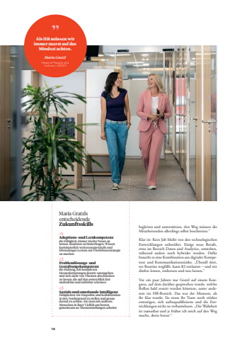 14begleiten und unterst%u00fctzen, den Weg m%u00fcssen die Mitarbeitenden allerdings selbst beschreiten.%u201cKlar ist: Kein Job bleibt von den technologischen Entwicklungen unber%u00fchrt. Einige neue Berufe, etwa im Bereich Daten und Analytics, entstehen, w%u00e4hrend andere noch hybrider werden. Daf%u00fcr braucht es eine Kombination aus digitaler Kompetenz und Kommunikationsst%u00e4rke. %u201e%u00dcberall dort, wo Routine wegf%u00e4llt, kann KI entlasten %u2013 und wir d%u00fcrfen lernen, entlernen und neu lernen.%u201cVor ein paar Jahren war Gratzl auf einem Kongress, auf dem dar%u00fcber gesprochen wurde, welche Rollen bald ersetzt werden k%u00f6nnten, unter anderem im HR-Bereich. Das war der Moment, als ihr klar wurde: Sie muss ihr Team noch st%u00e4rker ermutigen, sich aufzuqualifizieren und die Entwicklungen nicht zu verharmlosen. %u201eDie Wahrheit ist zumutbar und je fr%u00fcher ich mich auf den Weg mache, desto besser.%u201cMaria Gratzls entscheidende Zukunftsskills#1 Adaptions- und Lernkompetenzdie F%u00e4higkeit, immer wieder Neues zu lernen, Routinen zu hinterfragen, Wissen kontinuierlich weiterzuentwickeln und lebenslanges Lernen zur %u00dcberlebensstrategie zu machen#2 Probleml%u00f6sungs- und Gestaltungskompetenzdie Haltung, mit komplexen Herausforderungen kreativ umzugehen und sich nicht von Themen abschrecken zu lassen, die auf den ersten Blick fast undenkbar und unl%u00f6sbar scheinen #3 Soziale und emotionale IntelligenzF%u00e4higkeiten wie Empathie und Kollaboration in den Vordergrund zu stellen und genau darauf zu achten, wie man mit anderen Menschen in ihrer Vielfalt am besten gemeinsam an Themenstellungen arbeitet Als HR m%u00fcssen wir immer zuerst auf das Mindset achten.Maria GratzlHead of People and Culture, LIWEST