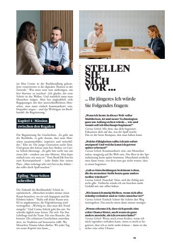 19STELLEN SIE SICH VOR %u2026%u2026 Ihr j%u00fcngeres Ich w%u00fcrde Sie Folgendes fragen:%u201eWenn ich heute in dieser Welt voller Multikrisen, KI und neuer Technologien ganz am Anfang stehen w%u00fcrde %u2026 wie und womit soll ich %u00fcberhaupt beginnen?%u201cCarina Schick: Mit dem, das dich begeistert. Fokussiere dich auf das, was dir Spa%u00df macht. Das ist der beste Kompass, den man haben kann.%u201eWelche F%u00e4higkeiten sollte ich mir sofort aneignen? Und welche kann ich getrost sp%u00e4ter erlernen?%u201cCarina Schick: Kommunikativ sein, mit Menschen reden, neugierig auf die Welt sein. Der Rest in der Spezialisierung kann sp%u00e4ter kommen. Manchmal entdeckt man dann etwas, von dem man gar nicht wusste, dass es einen begeistert.%u201eGab es Entscheidungen in deinem Leben, die du an meiner Stelle heute ganz anders treffen w%u00fcrdest?%u201cCarina Schick: Pauschal: Nein, weil der Erfolg mir recht gibt. Vielleicht w%u00fcrde ich ein bisschen mehr Geduld mit mir selbst haben.%u201eWie kann ich mutig bleiben, wenn sich alles st%u00e4ndig ver%u00e4ndert und so vieles unsicher ist?%u201cCarina Schick: Einfach Schritt f%u00fcr Schritt den Weg weitergehen. Das macht einen dann immer mutiger.%u201eWoran erkenne ich, dass sich gerade eine echte Chance bietet, auch wenn sie ganz anders aussieht, als ich erwartet habe?%u201cCarina Schick: Wenn mich etwas fordert, wenn ich mich irgendwo verhaken kann, wenn es mich so begeistert, dass ich es nicht mehr loslasse %u2013 dann ist das sicher eine echte Chance.im Max Center in der Buchhandlung gelernt. Jetzt verantwortet er die digitalen Themen in der Zentrale.%u201c Was muss man nun mitbringen, um hier Karriere zu machen? %u201eIch glaube, der erste Schritt ist das Wollen. Und nat%u00fcrlich muss man Menschen m%u00f6gen. Man hat unglaublich viele Begegnungen mit den unterschiedlichsten Menschen, man muss einfach kommunikativ sein, Empathie zeigen %u2013%u00a0und das Wichtigste im Buchhandel: die Begeisterung.%u201c Kapitel 4 | Mission zwischen den Regalen Die Begeisterung f%u00fcr Geschichten. %u201eEs geht um die Buchliebe, es geht darum, dass man Menschen zusammenf%u00fchrt, inspiriert und weiterbildet.%u201c Klar ist: Die junge Generation sucht Sinn. Und genau den k%u00f6nne man hier finden, ist Carina Schick %u00fcberzeugt. %u201eEs geht hier nicht nur um einen Job %u2013 sondern um eine Mission. Man kann einfach sein, wie man ist.%u201c Vom BookTok-Fan bis zum Kartenspielnerd %u2013 jeder findet hier seinen Platz. %u201eMan verbringt sehr viel Zeit in der Arbeit %u2013 das sollte doch Spa%u00df machen.%u201c Epilog | Neue Seiten schreiben Die Zukunft des Buchhandels? Schick ist optimistisch. %u201eMenschen werden immer einen Raum brauchen, wo sie sich begegnen und ihr Erlebnis haben.%u201c Thalia soll dieser Raum sein. KI ist angekommen, die Digitalisierung wird weitergehen. %u201eWichtig ist, dass man den Trend mitgeht.%u201c Und Carina Schick geht ihn mit. Sie schreibt t%u00e4glich neue Seiten. F%u00fcr sich. F%u00fcr ihre Lehrlinge und ihr Team. F%u00fcr eine Branche, die beweist: Die sch%u00f6nsten Geschichten entstehen dort, wo Tradition auf Innovation trifft. Wo Menschen Tr%u00e4ume leben d%u00fcrfen. Wo jeder Tag ein neues Kapitel sein kann._