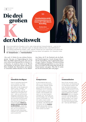 22Die drei gro%u00dfenderArbeitsweltDie wirtschaftliche Situation ist f%u00fcr viele Unternehmen herausfordernd %u2013 und mit ihr befindet sich auch der Jobmarkt stark im Wandel. Bettina Kern, Gesch%u00e4ftsf%u00fchrerin von KERN engineering careers, wei%u00df, welche Trends auf uns zukommen und warum es unverzichtbar ist, in der Unternehmensf%u00fchrung darauf einzugehen. Ein Gespr%u00e4ch %u00fcber KI, Kompetenzen und Kommunikation.Text Melanie KashoferFoto Antje Wolm#1K%u00fcnstliche IntelligenzDass KI nachhaltig beeinflusst, wie wir arbeiten, ist l%u00e4ngst kein Geheimnis mehr. Was jetzt z%u00e4hlt, ist der Umgang mit diesem neuen %u201eKollegen%u201c. %u201eKI kann viele Dinge, in denen wir schlecht sind, oder die wir vielleicht gar nicht gerne machen %u2013 seien es administrative T%u00e4tigkeiten, Recherchen oder andere Routineaufgaben. Doch die menschliche Komponente ist etwas, das ein Roboter nur sehr schwer ersetzen kann.%u201c Unsere Aufgabe: kritisch zu denken und nicht alles blind zu %u00fcbernehmen. %u201eUnsere Gef%u00fchle, unsere Emotionen sind das, was uns sympathisch macht und den Unterschied zwischen uns und einem Computer auszeichnet.%u201c#3KommunikationWas oft den zentralen Unterschied macht, ob Mitarbeitende im Unternehmen bleiben oder nicht: die interne Kommunikation. Gerade wirtschaftliche Themen sind schwierig zu kommunizieren, sollten aber immer direkt angesprochen werden. %u201eEhrlichkeit w%u00e4hrt am l%u00e4ngsten und wenn schwierige Zeiten kommen oder der Rotstift angesetzt werden muss, sollten die Mitarbeitenden es direkt von ihrer F%u00fchrungskraft erfahren %u2013 nicht aus den Medien.%u201c_#2KompetenzenAll das bedeutet aber auch, dass wir uns neue Kompetenzen aneignen, flexibler werden und umdenken m%u00fcssen. Ein Beispiel f%u00fcr so eine Zukunftskompetenz: gut zu prompten und der KI genau zu kommunizieren, wie sie arbeiten soll, damit wir mit dem Ergebnis zufrieden sind. %u201eDie KI gibt uns eine Grundlage, was wir daraus machen, entscheiden wir.%u201c Und: Wir sollten unsere zutiefst menschlichen F%u00e4higkeiten wieder st%u00e4rken. %u201eWas der Mensch oft verlernt hat: das Zuh%u00f6ren. Denken Sie an einen wirklich guten Verk%u00e4ufer. Der wird viel mehr zuh%u00f6ren als reden.%u201c Unsicherheiten nicht zu kommunizieren, ist immer der schlechteste Ratschlag.Bettina KernGesch%u00e4ftsf%u00fchrerin, KERN engineering careers%u201eNur noch 14 Schritte bis zum n%u00e4chsten Karrieresprung%u201c, liest man am Treppenaufgang des Linzer B%u00fcros von KERN engineering careers. Die Lust auf einen solchen Karrieresprung teilen im Moment viele Menschen. In unsicheren Zeiten ist der Wunsch nach Sicherheit im Job gro%u00df. Darum verlassen etablierte Fachkr%u00e4fte ihre Unternehmen und wechseln in vermeintlich stabilere Branchen wie den %u00f6ffentlichen Sektor, die IT, das Handwerk oder das Bankund Versicherungswesen. Gerade deswegen lohnt es sich f%u00fcr Unternehmen, auch in stagnierenden Zeiten auf gutes Employer Branding, Personalentwicklung und Weiterbildungsm%u00f6glichkeiten zu setzen. Bettina Kern ist seit Jahren im Recruiting t%u00e4tig und sieht die Trends kommen und gehen. Diese drei K werden laut ihr die kommenden Jahre stark pr%u00e4gen: