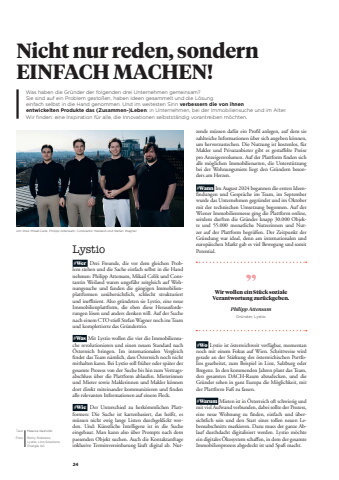24Nicht nur reden, sondern EINFACH MACHEN!Was haben die Gr%u00fcnder der folgenden drei Unternehmen gemeinsam? Sie sind auf ein Problem gesto%u00dfen, haben Ideen gesammelt und die L%u00f6sung einfach selbst in die Hand genommen. Und im weitesten Sinn verbessern die von ihnen entwickelten Produkte das (Zusammen-)Leben: in Unternehmen, bei der Immobiliensuche und im Alter. Wir finden: eine Inspiration f%u00fcr alle, die Innovationen selbstst%u00e4ndig vorantreiben m%u00f6chten.Text Melanie KashoferFoto Romy Robotics; Lystio; Lino Solutions: Energie AGLystio #Wer Drei Freunde, die vor dem gleichen Problem stehen und die Sache einfach selbst in die Hand nehmen: Philipp Attensam, Mikail Celik und Constantin Weiland waren ungef%u00e4hr zeitgleich auf Wohnungssuche und fanden die g%u00e4ngigen Immobilienplattformen un%u00fcbersichtlich, schlecht strukturiert und ineffizient. Also gr%u00fcndeten sie Lystio, eine neue Immobilienplattform, die eben diese Herausforderungen l%u00f6sen und anders denken will. Auf der Suche nach einem CTO stie%u00df Stefan Wagner noch ins Team und komplettierte das Gr%u00fcndertrio. #Was Mit Lystio wollen die vier die Immobiliensuche revolutionieren und einen neuen Standard nach %u00d6sterreich bringen. Im internationalen Vergleich findet das Team n%u00e4mlich, dass %u00d6sterreich noch nicht mithalten kann. Bei Lystio soll fr%u00fcher oder sp%u00e4ter der gesamte Prozess von der Suche bis hin zum Vertragsabschluss %u00fcber die Plattform ablaufen. Mieterinnen und Mieter sowie Maklerinnen und Makler k%u00f6nnen dort direkt miteinander kommunizieren und finden alle relevanten Informationen auf einem Fleck. #Wie Der Unterschied zu herk%u00f6mmlichen Plattformen: Die Suche ist kartenbasiert, das hei%u00dft, es m%u00fcssen nicht ewig lange Listen durchgeklickt werden. Und: K%u00fcnstliche Intelligenz ist in die Suche eingebaut. Man kann also %u00fcber Prompts nach dem passenden Objekt suchen. Auch die Kontaktanfrage inklusive Terminvereinbarung l%u00e4uft digital ab. Nutzende m%u00fcssen daf%u00fcr ein Profil anlegen, auf dem sie zahlreiche Informationen %u00fcber sich angeben k%u00f6nnen, um hervorzustechen. Die Nutzung ist kostenlos, f%u00fcr Makler und Privatanbieter gibt es gestaffelte Preise pro Anzeigenvolumen. Auf der Plattform finden sich alle m%u00f6glichen Immobilienarten, die Unterst%u00fctzung bei der Wohnungsmiete liegt den Gr%u00fcndern besonders am Herzen. #Wann Im August 2024 begannen die ersten Ideenfindungen und Gespr%u00e4che im Team, im September wurde das Unternehmen gegr%u00fcndet und im Oktober mit der technischen Umsetzung begonnen. Auf der Wiener Immobilienmesse ging die Plattform online, seitdem durften die Gr%u00fcnder knapp 30.000 Objekte und 55.000 monatliche Nutzerinnen und Nutzer auf der Plattform begr%u00fc%u00dfen. Der Zeitpunkt der Gr%u00fcndung war ideal, denn am internationalen und europ%u00e4ischen Markt gab es viel Bewegung und somit Potential.Wir wollen ein St%u00fcck soziale Verantwortung zur%u00fcckgeben.Philipp AttensamGr%u00fcnder, Lystiovon links: Mikail Celik, Philipp Attensam, Constantin Weiland und Stefan Wagner #Wo Lystio ist %u00f6sterreichweit verf%u00fcgbar, momentan noch mit einem Fokus auf Wien. Schrittweise wird gerade an der St%u00e4rkung des %u00f6sterreichischen Portfolios gearbeitet, zum Beispiel in Linz, Salzburg oder Bregenz. In den kommenden Jahren plant das Team, den gesamten DACH-Raum abzudecken, und die Gr%u00fcnder sehen in ganz Europa die M%u00f6glichkeit, mit der Plattform Fu%u00df zu fassen. #Warum Mieten ist in %u00d6sterreich oft schwierig und mit viel Aufwand verbunden, dabei sollte der Prozess, eine neue Wohnung zu finden, einfach und %u00fcbersichtlich sein und den Start eines tollen neuen Lebensabschnitts markieren. Dazu muss der ganze Ablauf durchdacht digitalisiert werden. Lystio m%u00f6chte ein digitales %u00d6kosystem schaffen, in dem der gesamte Immobilienprozess abgedeckt ist und Spa%u00df macht.
