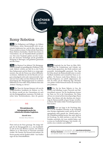 25Romy Robotics #Wer Vier Kolleginnen und Kollegen, ein fr%u00fcheres Unternehmen, dessen Businessmodell nicht wie gew%u00fcnscht funktioniert hat, und die Idee, daraus etwas Neues entstehen zu lassen. So l%u00e4sst sich das Team hinter Romy Robotics beschreiben. Harold Artes leitete ein Unternehmen, das auf Haushaltsrobotik spezialisiert war. Drei seiner Teamleads spielten mit dem Gedanken, die innovative Technologie auf die gewerbliche Reinigung zu %u00fcbertragen, und gr%u00fcndeten gemeinsam mit ihm erneut. #Was Der Business-Case dahinter? Die Reinigungsindustrie k%u00e4mpft mit grundlegenden Problemen: F%u00fchrende Anbieter verlieren pro Jahr bis zu drei Viertel ihres Fachpersonals und der Markt ist so streng reglementiert, dass sich die Firmen nur schwer differenzieren k%u00f6nnen. Au%u00dferdem hat sich die Branche seit Langem technologisch nicht mehr weiterentwickelt. Artes und sein Team wollen mit ihren Robotern f%u00fcr die Bodenreinigung dem Reinigungspersonal ein modernes Hilfsmittel zur Seite stellen. Romy Robotics bietet also %u201eRobotic Cleaning as a Service%u201c. #Wie Das Team des Startups k%u00fcmmert sich um die ma%u00dfgeschneiderte Installation der Roboter vor Ort. Sie arbeiten sowohl mit den Unternehmen als auch mit den Reinigungsfirmen zusammen. F%u00fcr beide entstehen keine Investitionskosten, denn die gesamte Flotte wird aus der Ferne gemanagt. Die einzige Aufgabe f%u00fcr die Reinigungskr%u00e4fte ist es, den Staubbeh%u00e4lter alle ein bis zwei Wochen zu leeren. Die Software dahinter ist zu 100 Prozent in %u00d6sterreich entwickelt worden. Die Vorteile: Das Personal wird entlastet, die Kosten gesenkt und die Qualit%u00e4t erh%u00f6ht %u2013 laut Studien sogar um das Zweieinhalbfache.Wir m%u00f6chten die Reinigungsbranche ins robotische Zeitalter begleiten.Harold ArtesGr%u00fcnder, Romy Robotics #Wann Gegr%u00fcndet hat das Team im M%u00e4rz 2024. Vorab haben die Gr%u00fcnderinnen und Gr%u00fcnder mit vielen Kunden gesprochen, den Markt analysiert und potentielle Anwendungsf%u00e4lle gesammelt. Nun liegt der Fokus darauf, das Businessmodell weiter zu testen, Feedback einzuholen und eventuell das Team zu vergr%u00f6%u00dfern. Vor Kurzem wurde Romy Robotics in das Incubate-Programm von tech2b aufgenommen, bei dem der Fokus auf der Skalierung liegt. Besonders vom gro%u00dfen tech2b-Netzwerk konnte das Startup bis jetzt profitieren. #Wo Den Sitz hat Romy Robotics in Linz, die Kunden sind allerdings in ganz %u00d6sterreich und S%u00fcddeutschland vertreten. F%u00fcr die Installationen kommt das Team vor Ort in die Unternehmen. Der Fokus soll nun erst einmal auf dem deutschsprachigen Raum liegen. Artes k%u00f6nnte sich aber durchaus eine Ausweitung des Businessmodells auf ganz Europa vorstellen. In diesem Fall w%u00fcrden lokale Vertriebsorganisationen Sinn machen. #Warum Artes war lange in der Forschung t%u00e4tig, bis er an der Standford University in die Gr%u00fcndung eines Startups eingebunden wurde und ihn die Startupumgebung sofort gepackt hat. Schnell merkte er: Die Produktentwicklung bereitet ihm mehr Spa%u00df als die Forschung. Vor allem m%u00f6chten er und sein Team Produkte entwickeln, die Leute n%u00fctzlich finden, und so etwas zur Gesellschaft beitragen. Sein Antrieb: %u201eIch m%u00f6chte etwas ver%u00e4ndern und auffallen!%u201cvon links: Vladimir Alexandrov, Erwin Mascher, Astrid Brein, Harold ArtesGR%u00dcNDERGeistDieses Startup wird von tech2b, dem ober%u00f6sterreichischen Startup-Inkubator, unterst%u00fctzt. Alle Infos rund um die Programme von tech2b findet man unter tech2b.at.