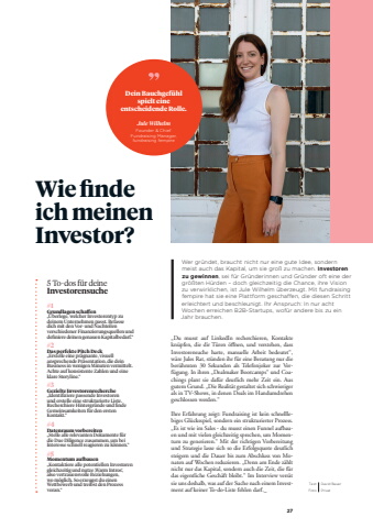 275 To-dos f%u00fcr deine Investorensuche#1Grundlagen schaffen%u201e%u00dcberlege, welcher Investorentyp zu deinem Unternehmen passt. Befasse dich mit den Vor- und Nachteilen verschiedener Finanzierungsquellen und definiere deinen genauen Kapitalbedarf.%u201c#2 Das perfekte Pitch Deck%u201eErstelle eine pr%u00e4gnante, visuell ansprechende Pr%u00e4sentation, die dein Business in wenigen Minuten vermittelt. Achte auf konsistente Zahlen und eine klare Storyline.%u201c#3Gezielte Investorenrecherche%u201eIdentifiziere passende Investoren und erstelle eine strukturierte Liste. Recherchiere Hintergr%u00fcnde und finde Gemeinsamkeiten f%u00fcr den ersten Kontakt.%u201c#4Datenraum vorbereiten%u201eStelle alle relevanten Dokumente f%u00fcr die Due Diligence zusammen, um bei Interesse schnell reagieren zu k%u00f6nnen.%u201c#5 Momentum aufbauen%u201eKontaktiere alle potentiellen Investoren gleichzeitig und nutze %u201aWarm Intros%u2018, also vertrauensvolle Beziehungen, wo m%u00f6glich. So erzeugst du einen Wettbewerb und treibst den Prozess voran.%u201cWie finde ich meinen Investor?Wer gr%u00fcndet, braucht nicht nur eine gute Idee, sondern meist auch das Kapital, um sie gro%u00df zu machen. Investoren zu gewinnen, sei f%u00fcr Gr%u00fcnderinnen und Gr%u00fcnder oft eine der gr%u00f6%u00dften H%u00fcrden %u2013 doch gleichzeitig die Chance, ihre Vision zu verwirklichen, ist Jule Wilhelm %u00fcberzeugt. Mit fundraising fempire hat sie eine Plattform geschaffen, die diesen Schritt erleichtert und beschleunigt. Ihr Anspruch: In nur acht Wochen erreichen B2B-Startups, wof%u00fcr andere bis zu ein Jahr brauchen.%u201eDu musst auf LinkedIn recherchieren, Kontakte kn%u00fcpfen, die dir T%u00fcren %u00f6ffnen, und verstehen, dass Investorensuche harte, manuelle Arbeit bedeutet%u201c, w%u00e4re Jules Rat, st%u00fcnden ihr f%u00fcr eine Beratung nur die ber%u00fchmten 30 Sekunden als Telefonjoker zur Verf%u00fcgung. In ihren %u201eDealmaker Bootcamps%u201c und Coachings plant sie daf%u00fcr deutlich mehr Zeit ein. Aus gutem Grund. %u201eDie Realit%u00e4t gestaltet sich schwieriger als in TV-Shows, in denen Deals im Handumdrehen geschlossen werden.%u201c Ihre Erfahrung zeigt: Fundraising ist kein schnelllebiges Gl%u00fccksspiel, sondern ein strukturierter Prozess. %u201eEs ist wie im Sales - du musst einen Funnel aufbauen und mit vielen gleichzeitig sprechen, um Momentum zu generieren.%u201c Mit der richtigen Vorbereitung und Strategie lasse sich so die Erfolgsquote deutlich steigern und die Dauer bis zum Abschluss von Monaten auf Wochen reduzieren. %u201eDenn am Ende z%u00e4hlt nicht nur das Kapital, sondern auch die Zeit, die f%u00fcr das eigentliche Gesch%u00e4ft bleibt.%u201c Im Interview verr%u00e4t sie uns deshalb, was auf der Suche nach einem Investment auf keiner To-do-Liste fehlen darf._Dein Bauchgef%u00fchl spielt eine entscheidende Rolle.Jule WilhelmFounder & Chief Fundraising Manager, fundraising fempireText David BauerFoto Privat