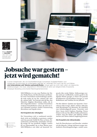 32Jobsuche war gestern %u2013 jetzt wird gematcht!In einer Arbeitswelt, die von Fachkr%u00e4ftemangel, komplexen Aufgabenfeldern und steigenden Erwartungen an Arbeitgeber gepr%u00e4gt ist, ver%u00e4ndert sich auch die Art und Weise,wie Unternehmen und Talente zueinanderfinden. L%u00e4ngst geht es nicht mehr allein um klassische Stellenanzeigen. Die neue Jobplattform MACHERjobs.at setzt auf zielgerichtete Ansprache, Employer Branding und smarte Matchingmechanismen.Text Melanie KashoferFoto Gettyimages / Farknot_Architect; Antje WolmMACHERjobs.at ist eine neue Plattform des Macher Media Houses, die Bewerberinnen und Bewerber sowie Unternehmen zusammenbringen m%u00f6chte, die mehr suchen als nur den %u201en%u00e4chsten Job%u201c oder die %u201en%u00e4chste Stelle%u201c. Im Zentrum steht die Idee, dass Menschen Aufgaben %u00fcbernehmen wollen, die sie aktiv mitgestalten k%u00f6nnen %u2013 und dass Unternehmen wiederum Pers%u00f6nlichkeiten suchen, die nicht nur einen Lebenslauf vorweisen, sondern Verantwortung %u00fcbernehmen und Impulse setzen.Die Perspektive der ArbeitgeberF%u00fcr Unternehmen wird es zunehmend entscheidend, nicht nur Fachkr%u00e4fte zu gewinnen, sondern auch das passende Umfeld f%u00fcr diese zu bieten. Bewerberinnen und Bewerber entscheiden sich h%u00e4ufig weniger f%u00fcr eine spezifische Aufgabe, sondern f%u00fcr ein Arbeitsumfeld, das zu ihren Werten passt. MACHERjobs.at setzt dabei auf dezentrale Ansprache %u00fcber soziale Medien. Stellenanzeigen werden nicht nur ver%u00f6ffentlicht, sondern gezielt in die digitalen R%u00e4ume getragen, in denen sich passende Kandidatinnen und Kandidaten bewegen, je nach Bed%u00fcrfnissen und Vorlieben bei der Jobsuche. Die Idee dahinter: Qualit%u00e4t statt Quantit%u00e4t. Unternehmen sollen weniger %u201eKlicks%u201c erhalten, daf%u00fcr aber mehr Bewerbungen von Menschen, die tats%u00e4chlich zum Anforderungsprofil passen. Unterst%u00fctzt wird dieser Ansatz durch Employer Branding: Firmen k%u00f6nnen nicht nur ihre offenen Stellen pr%u00e4sentieren, sondern auch ihre Kultur und Haltung sichtbar machen und Talente dadurch langfristig gewinnen.Die Perspektive der JobsuchendenAuch f%u00fcr Bewerberinnen und Bewerber ver%u00e4ndert sich die Jobsuche. Gefragt sind heute weniger standardisierte Bewerbungsunterlagen, sondern aussaBereit, Karriere zu MACHEN? Jetzt QR-Code scannen und durchstarten!