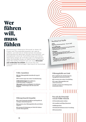 36Wer f%u00fchren will, muss f%u00fchlenDie Stimmung in %u00d6sterreichs Wirtschaft ist d%u00fcster: 83 Prozent der F%u00fchrungskr%u00e4fte bewerten die Lage als schlecht, und mehr als ein Drittel rechnet mit weiterer Verschlechterung. Besonders dr%u00fccken hohe Personal- und Energiekosten sowie der Fachkr%u00e4ftemangel aufs Gem%u00fct. Gleichzeitig steigen die Anforderungen ans Management stetig. Eine aktuelle Studie von Ward Howell International zeigt: Wer k%u00fcnftig erfolgreich sein will, muss Wirtschaft und Leadership neu denken. Ein Grund, bei zwei F%u00fchrungskr%u00e4ften nachzufragen: Was braucht es heutzutage wirklich?Tr%u00fcbe Aussichten83 % der F%u00fchrungskr%u00e4fte beurteilen die Lage als schlecht.38 % erwarten sogar eine weitere Verschlechterung.Gr%u00f6%u00dfte Belastungen: Personalkosten, Fachkr%u00e4ftemangel, EnergiepreiseAber auch: Wettbewerbsf%u00e4higkeit, Investitionen, politische Ver%u00e4nderungen oder die neuen ESGVorgabenF%u00fchrung braucht Empathie53 % sehen emotionale Intelligenz und Empathie als wichtigste Zukunftskompetenz.94 % erwarten, dass F%u00fchrungskr%u00e4fte off en mit Fehlern umgehen.82 % betonen die Bedeutung von Work-Life-Balance auch f%u00fcr F%u00fchrungskr%u00e4fte.F%u00fchrungskr%u00e4fte am Limit87 % empfi nden die Anforderungen im Management schon heute als hoch.62 % erwarten eine weitere Versch%u00e4rfung.57 % sagen: F%u00fchrungskr%u00e4fte sind schwer zu besetzen.Nur 36 % erwarten eine Erholung in den kommenden Jahren.Was sich die Wirtschaft von der Politik w%u00fcnscht#1 Wirtschaftsstandort st%u00e4rken#2 Gesundheit und Pfl ege fokussieren#3 Bildungsreform#4 Strukturelle Reformen in der Verwaltung#5 PensionsreformSteckbrief zur StudieTitel: Ward Howell International %u2013 Survey 2025Durchf%u00fchrung: Ward Howell International in Kooperation mit TQS Research & ConsultingBefragte: 235 Entscheidungstr%u00e4gerinnen und Entscheidungstr%u00e4ger aus der %u00f6sterreichischen WirtschaftZiel:aufzeigen, wie sich Anforderungen an Management und F%u00fchrungskultur in Zeiten multipler Krisen ver%u00e4ndern