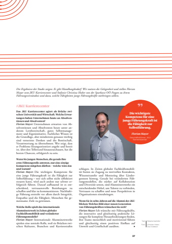 37Das JKU Karrierecenter agiert als Br%u00fccke zwischen Universit%u00e4t und Wirtschaft. Welche Erwartungen haben Unternehmen heute an Absolventinnen und Absolventen?Florian Mayer: Unternehmen erwarten von Absolventinnen und Absolventen heute unter anderem Lernbereitschaft, gutes Selbstmanagement und Eigeninitiative. Fachliches Wissen ist die Grundlage, aber mindestens genauso wichtig sind vernetztes Denken und die Bereitschaft, Verantwortung zu %u00fcbernehmen. Wer zeigt, dass er Probleme l%u00f6sungsorientiert angeht und bereit ist, %u00fcber den Tellerrand hinauszuschauen, hat die besten Chancen, erfolgreich zu sein.Wenn Sie jungen Menschen, die gerade ihre erste F%u00fchrungsrolle antreten, nur eine einzige Kompetenz mitgeben d%u00fcrften %u2013 welche w%u00e4re das und warum?Florian Mayer: Die wichtigste Kompetenz f%u00fcr eine junge F%u00fchrungskraft ist die F%u00e4higkeit zur Selbstf%u00fchrung %u2013 wer sich selbst nicht reflektiert steuern kann, wird auch andere nur schwer erfolgreich f%u00fchren. Darauf aufbauend ist es entscheidend, vertrauensvolle Beziehungen zu schaffen und klar zu kommunizieren. Nachhaltige F%u00fchrung entsteht vor allem durch Integrit%u00e4t, Empathie und die F%u00e4higkeit, Menschen f%u00fcr gemeinsame Ziele zu gewinnen.Welche Rolle spielt das internationale Alumninetzwerk in Zeiten globaler Fachkr%u00e4ftemobilit%u00e4t und ver%u00e4nderter F%u00fchrungsmodelle?Florian Mayer: Internationale Alumninetzwerke spielen eine zentrale Rolle, weil sie Br%u00fccken zwischen Kulturen, Branchen und Karrierestufen schlagen. In Zeiten globaler Fachkr%u00e4ftemobilit%u00e4t bieten sie Zugang zu wertvollen Kontakten, Wissenstransfer und Mentoring %u00fcber L%u00e4ndergrenzen hinweg. Gerade bei ver%u00e4nderten F%u00fchrungsmodellen, die st%u00e4rker auf Kollaboration und Diversit%u00e4t setzen, sind Alumninetzwerke ein entscheidender Hebel, um Talente zu verbinden, Vertrauen zu schaffen und neue Perspektiven in Organisationen einzubringen.Wenn Sie in zehn Jahren auf die Alumni der JKU blicken: Welches Bild einer neuen Generation von F%u00fchrungskr%u00e4ften w%u00fcnschen Sie sich?Florian Mayer: Ich w%u00fcnsche mir F%u00fchrungskr%u00e4fte, die innovative und gleichzeitig praktische L%u00f6sungen f%u00fcr komplexe Herausforderungen finden, ihre Teams menschlich und motivierend f%u00fchren und gleichzeitig einen positiven Einfluss auf Umwelt und Gesellschaft aus%u00fcben.#JKU KarrierecenterDie Ergebnisse der Studie zeigen: Es gibt Handlungsbedarf. Wir nutzen die Gelegenheit und stellen Florian Mayer vom JKU Karrierecenter und Stefanie Christina Huber von der Sparkasse O%u00d6 Fragen zu ihrem F%u00fchrungsverst%u00e4ndnis und dazu, welche F%u00e4higkeiten junge F%u00fchrungskr%u00e4fte mitbringen sollten.Text Melanie KashoferFoto Christian Huber, Zoe GoldsteinDie wichtigste Kompetenz f%u00fcr eine junge F%u00fchrungskraft ist die F%u00e4higkeit zur Selbstf%u00fchrung.Florian MayerGesch%u00e4ftsf%u00fchrer, JKU Karrierecenter