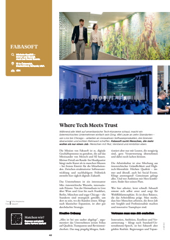 42Die Mission von Fabasoft ist es, digitale Gesch%u00e4ftsprozesse zu gestalten, die auf das Miteinander von Mensch und KI bauen. Kleines Detail am Rande: Im Headquarter h%u00e4ngt mehr Kunst als in manchen Museen %u2013 bei freiem Eintritt f%u00fcr die Mitarbeitenden. Zwischen strukturierter Softwareentwicklung und nachhaltigem Fr%u00fchst%u00fcck entsteht hier t%u00e4glich digitale Zukunft. Das Unternehmen ist ein interessanter Mix: %u00f6sterreichische Wurzeln, internationale Pr%u00e4senz. Von der Heimatbasis in Linz %u00fcber Wien und Graz bis nach Frankfurt, Berlin, M%u00fcnchen und sogar Chicago %u2013 die Standorte sind strategisch gew%u00e4hlt, um dort zu sein, wo die Kunden sitzen. Klingt nach klassischer Expansion, ist aber gut durchdachte Strategie.Kreative Ordnung %u201eAlles ist bei uns sauber abgelegt\mentiert das Unternehmen seinen Fokus auf Qualit%u00e4t, Transparenz und Revisionssicherheit. Das mag pingelig klingen, funkFABASOFT H%u00f6chste Qualit%u00e4t %u2013 immer und %u00fcberall. Auch bei Social Events.10 in %u00d6sterreich, Deutschland, Schweiz, USA494Matchen wir?Scannen und gleich deine Karriere starten!W%u00e4hrend alle Welt auf amerikanische Tech-Konzerne schaut, macht ein %u00f6sterreichisches Unternehmen einfach sein Ding. 494 Leute an zehn Standorten %u2013 von Linz bis Chicago %u2013 arbeiten an innovativen Softwareprodukten, die Grenzen %u00fcberwinden und echten Mehrwert schaffen. Fabasoft sucht Menschen, die mehr wollen als nur einen Job. Menschen mit Mut, Verstand und Ambition eben.Where Tech Meets Trusttioniert aber nur mit Leuten, die neugierig sind, gern Verantwortung %u00fcbernehmen und dabei noch lachen k%u00f6nnen.Die Arbeitskultur ist eine Mischung aus %u00f6sterreichischer Gr%u00fcndlichkeit und Hightech-Mentalit%u00e4t. H%u00f6chste Qualit%u00e4t %u2013 immer und %u00fcberall, auch bei Social Events. Klingt anstrengend? Gemeinsam gelingt alles. Und wer Ambition mit Herz kombiniert, findet hier seinen Platz.Wer hier arbeitet, lernt schnell: Fabasoft nimmt sich selbst ernst und sorgt f%u00fcr Wohlf%u00fchlatmosph%u00e4re. Es ist diese Balance, die das Arbeitsklima pr%u00e4gt. Man merkt, dass hier Menschen arbeiten, die ihren Job mit Sorgfalt und Professionalit%u00e4t machen und innovative Teamplayer sind.Vertrauen muss man sich erarbeiten Innovation, Ambition, Exzellenz und Verantwortung %u2013 klingt nach Standard-Unternehmens-Sprech, ist bei Fabasoft aber gelebte Realit%u00e4t. Regierungen und Topun-%u0009 Text%u0009 Zofia WegrzeckaFoto FabasoftANZEIGE
